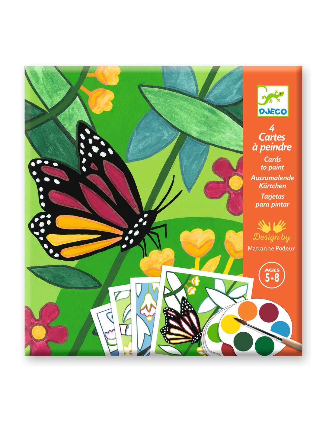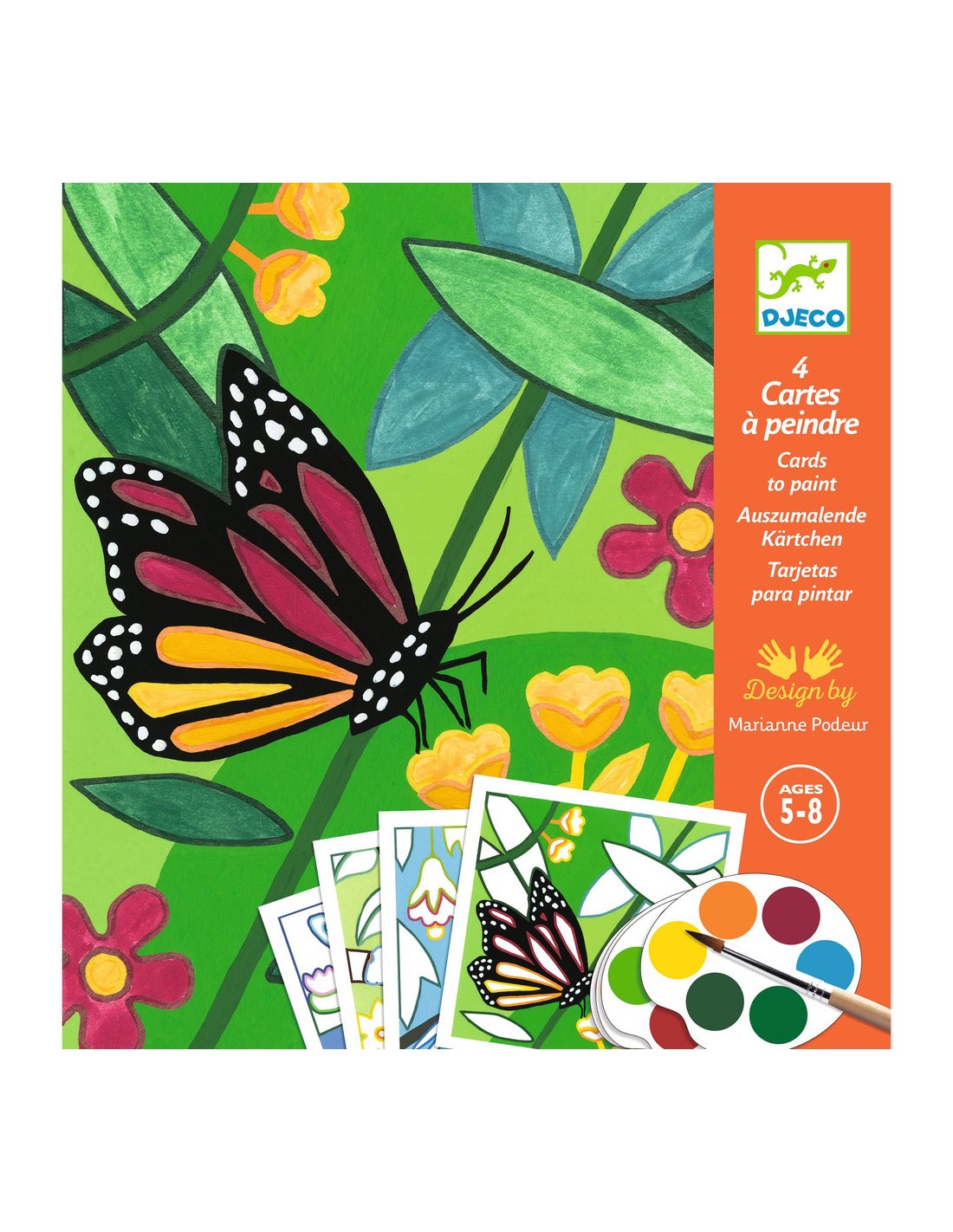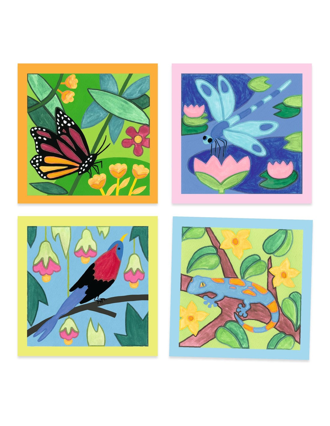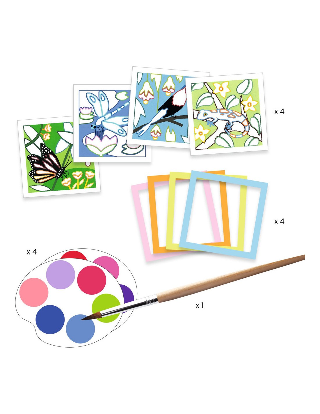 Contenu : 4 cartes à peindre (20 cm x 20 cm), 4 cadres colorés, 4 palettes en papier avec 6 ronds de peinture, 1 pinceau.