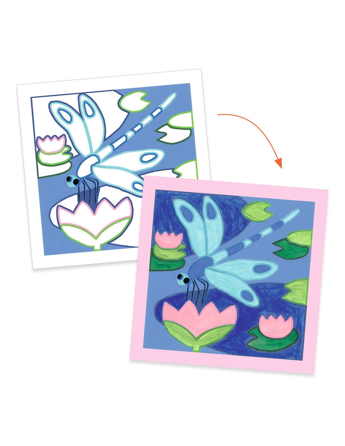 Une pochette idéale pour s’initier à la peinture : 4 cartes aux zones clairement délimitées, chacune accompagnée de sa palette de couleurs correspondante. Avec très peu d’eau, l’enfant peint facilement de larges surfaces comme de petits détails, puis associe sa réalisation à l’un des 4 cadres fournis pour la finaliser et l’exposer.