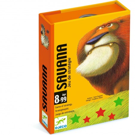Savanas, un jeu de cartes animaux rigolo ! Savana est un jeu de la marque Djeco qui peut se jouer en famille ! Les cartes indiquent une valeur, des étoiles de couleur verte ou rouge et une famille d'animaux. Lors d'un tour, les joueurs devront donner une carte de la famille posée par le premier joueur (éléphant, lion, hyène ou zèbre). La carte qui a la valeur la plus élevée remportera le pli. A la fin de la manche les joueurs compteront +1 point par étoile verte dans leurs plis et -1 point par étoile rouge.