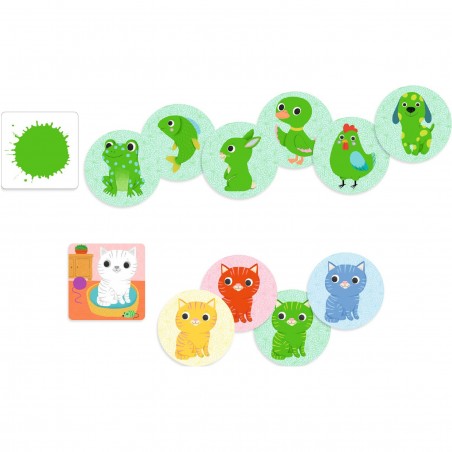 Un jeu de tri. Se débarrasser de ses cartes en suivant la consigne de tri de la carte tirée : couleur / animal. Un premier jeu de tri pour les tout-petits.