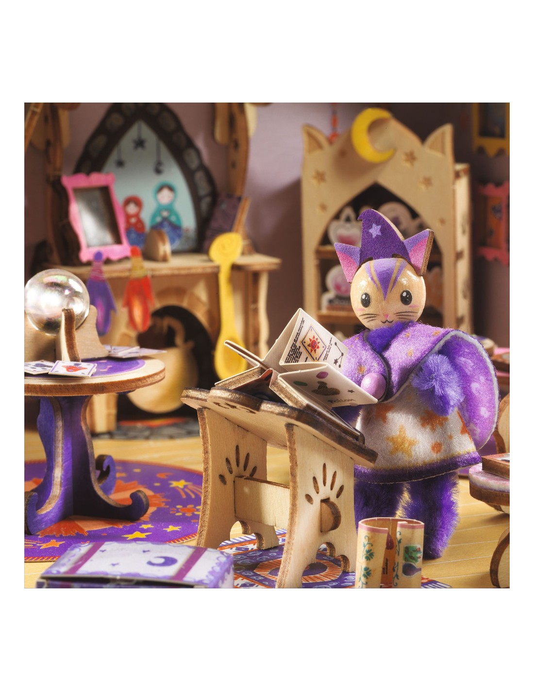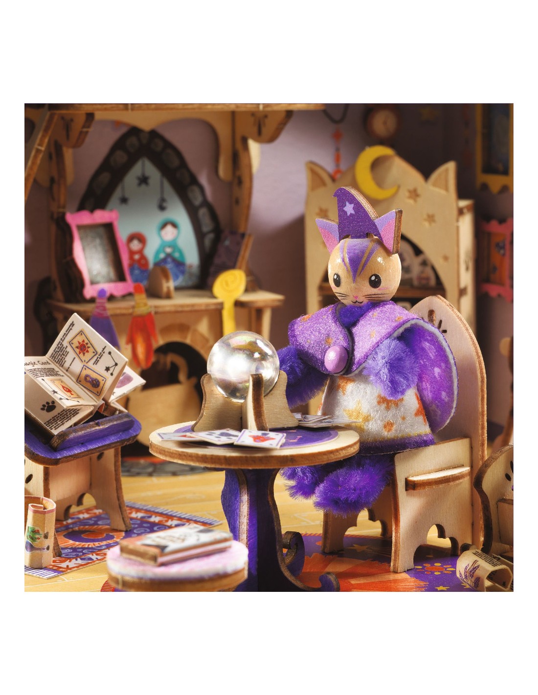 Contenu : 1 petite maison (dimensions fermée : 14.5 x 16.5 x 5 cm), 2 planches en bois lasérisé, 1 palette de peintures sèches et 1 pinceau, 1 nappe de protection, 3 planches de carte prédécoupée illustrée, 3 planches de stickers (1 planche de stickers illustrés, 1 planche de petites gommettes transparentes, 1 planche de stickers double face en mousse), 4 fils chenille, 1 tête et des oreilles illustrées en bois, 1 perle imitation boule de cristal, 1 bobine de fil, 1 planche de feutrine illustrée prédécoupée, 6 attaches parisiennes, 1 outil en carton pour fabriquer le mini personnage, 1 pince de précision, 1 tube de colle liquide à embout fin, 1 livret d'instructions détaillées.
