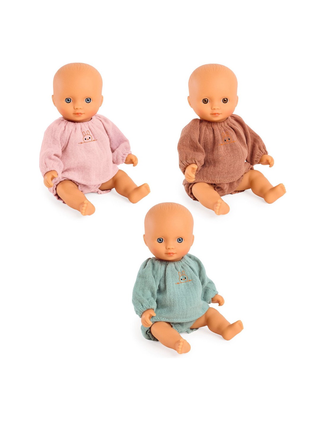 - 3 coloris assortis : tenue rose poudré/yeux bleus, tenue brun clair/yeux marron, tenue vert céladon/yeux bleus.