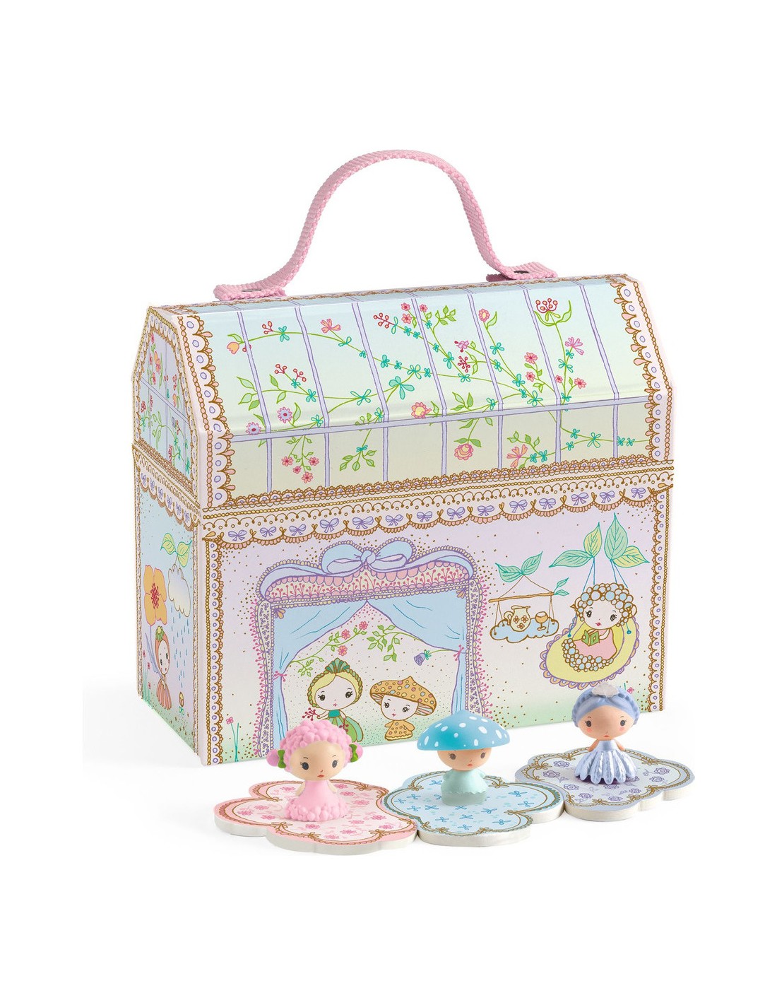 Contenu : 1 maison miniature nomade en carton imprimé avec une fermeture aimantée et une poignée textile + 2 étagères en carton imprimé assemblées et collées + 7 pcs en carton pour simuler des coussins ou créer un chemin + 7 compagnons figurines existantes recolorées : Fleur, Mushy, Lila, Bulle, Stella, Margo, Star.