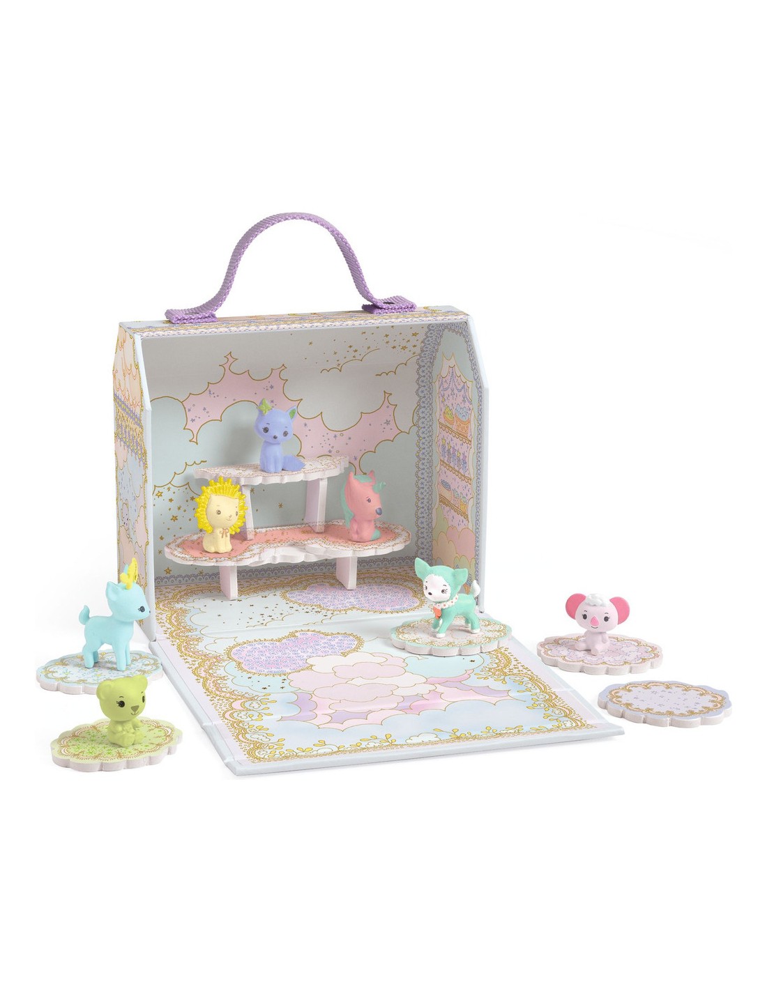 Contenu : 1 maison miniature nomade en carton imprimé avec une fermeture aimantée et une poignée textile + 2 étagères en carton imprimé assemblées et collées + 7 pcs en carton pour poser les animaux ou créer un chemin + 7 compagnons animaux existants recolorés : Polo, Gala, Fox, Bianca, Nours, Mia et Indie.