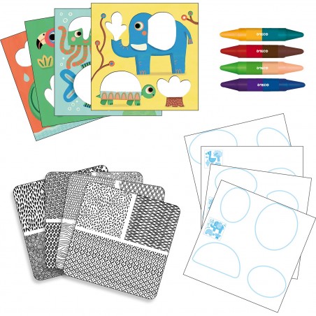 - Contenu : 20 fonds à frotter ( 5 modèles x 4 au format 20 x 20 cm), 4 enveloppes illustrées, 4 planches de motifs, 5 crayons de cire double côté (8 couleurs) et un livret explicatif pas à pas en couleurs.