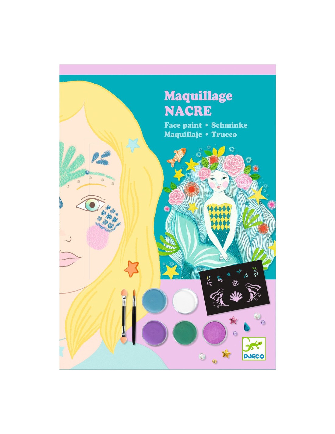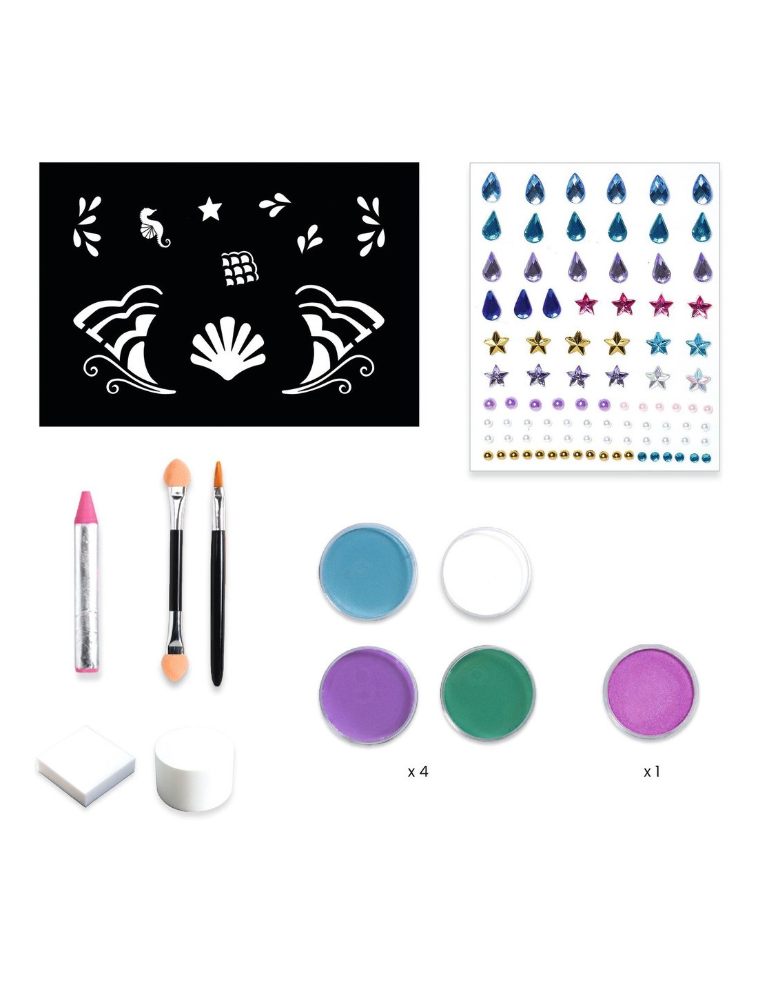 Contenu : 4 fards gras 1 fard à paupière métallisé 1 crayon 1 pinceau 2 mousses 1 pinceau ombreur double embout 1 planche de pochoirs de peau Environ 40 perles et strass adhésifs pour la peau 1 livret explicatif avec les pas à pas pour réaliser 3 modèles