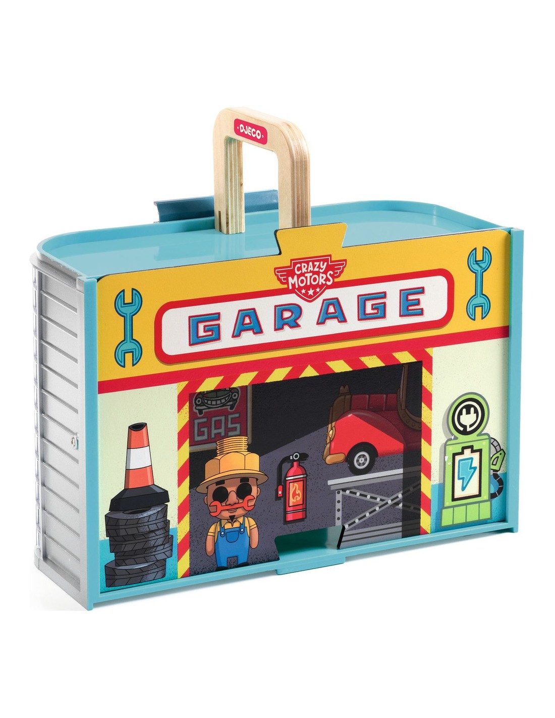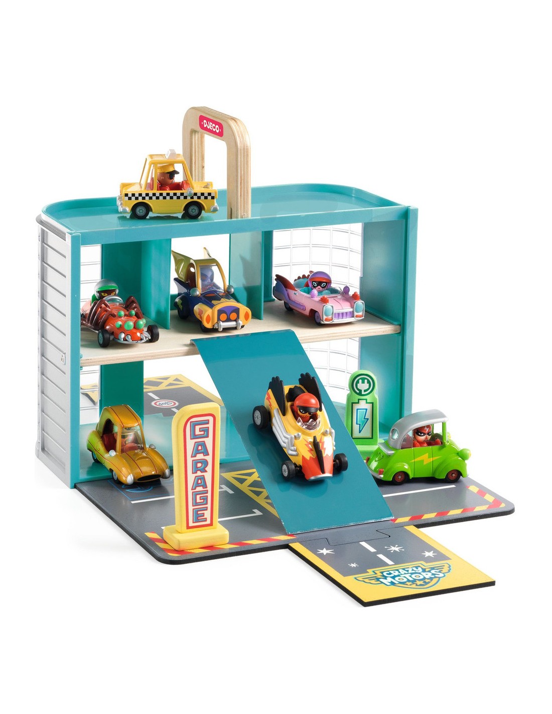Le garage idéal pour transporter et pour jouer avec les voitures Crazy Motors ! Ce garage se transforme en valisette pratique pour l’emporter partout. Il intègre une rampe pour des sorties express et une borne de recharge électrique pour remettre les bolides en piste. L’enfant installe la rampe et les panneaux, puis peut connecter le garage aux univers Circuit DJ05498 et Puzzle'Up City DJ05499, créant ainsi un véritable décor de ville autour du garage.