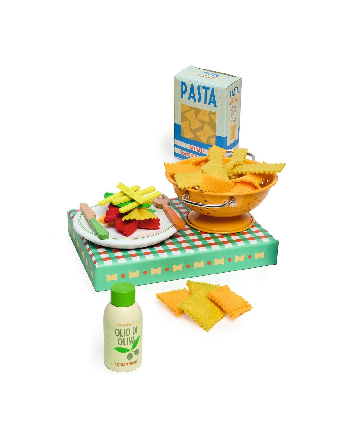 Contenu : 22 pièces : 4 raviolis, 4 farfalle, 4 mafaldine, 1 coulis de sauce tomate, 1 feuille de basilic, 4 fromages râpés en feutrine, 1 assiette et 1 bouteille d'huile d'olive en bois, 1 passoire en métal, 1 boîte de pâtes en carton.