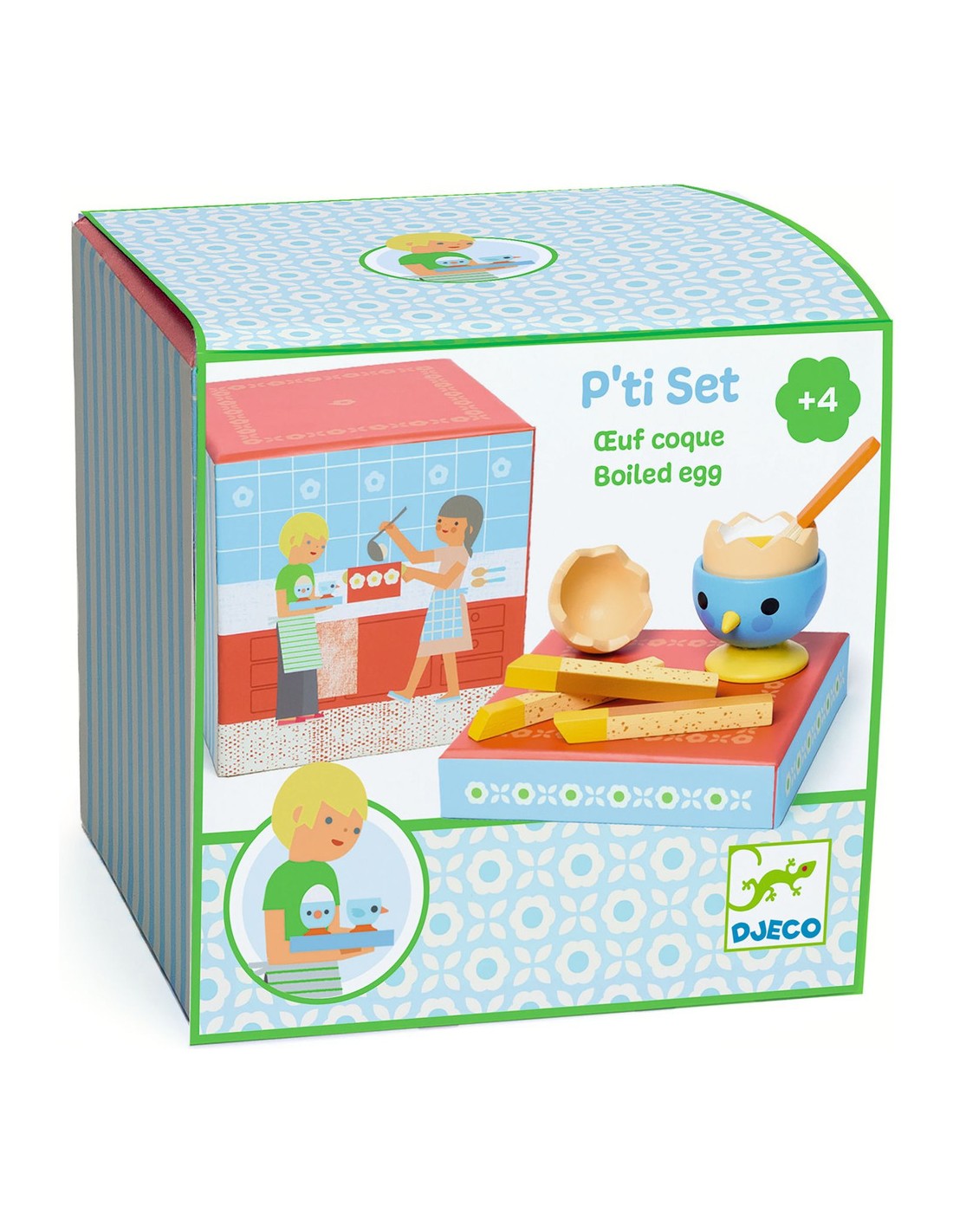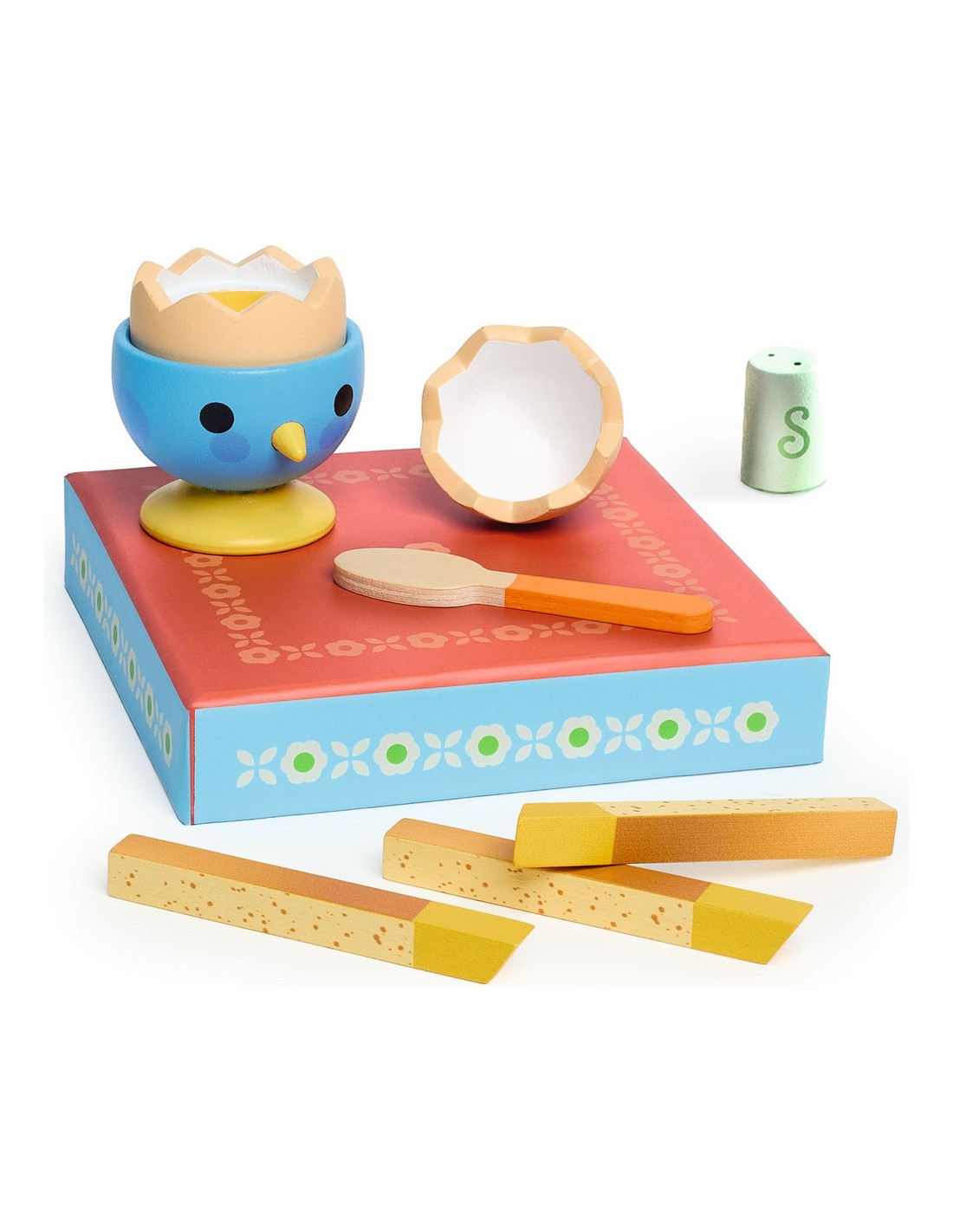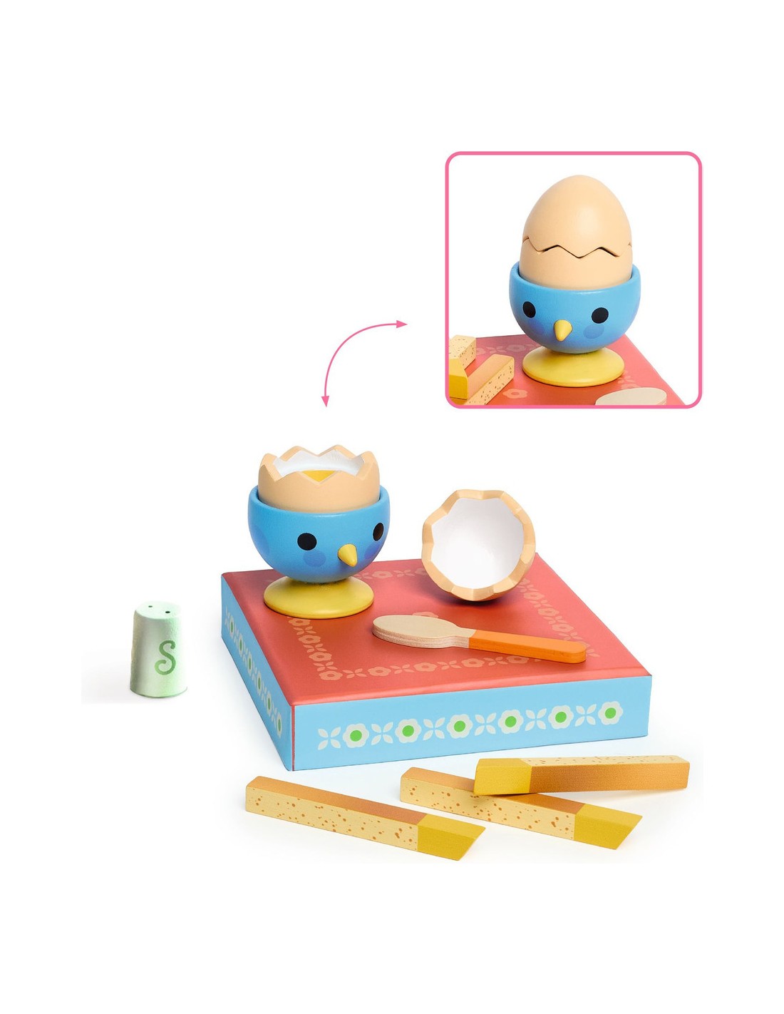 Contenu : 8 pièces : 1 cuillère, 1 coquetier, 1 œuf en 2 parties, 3 mouillettes de pain, 1 salière en bois.