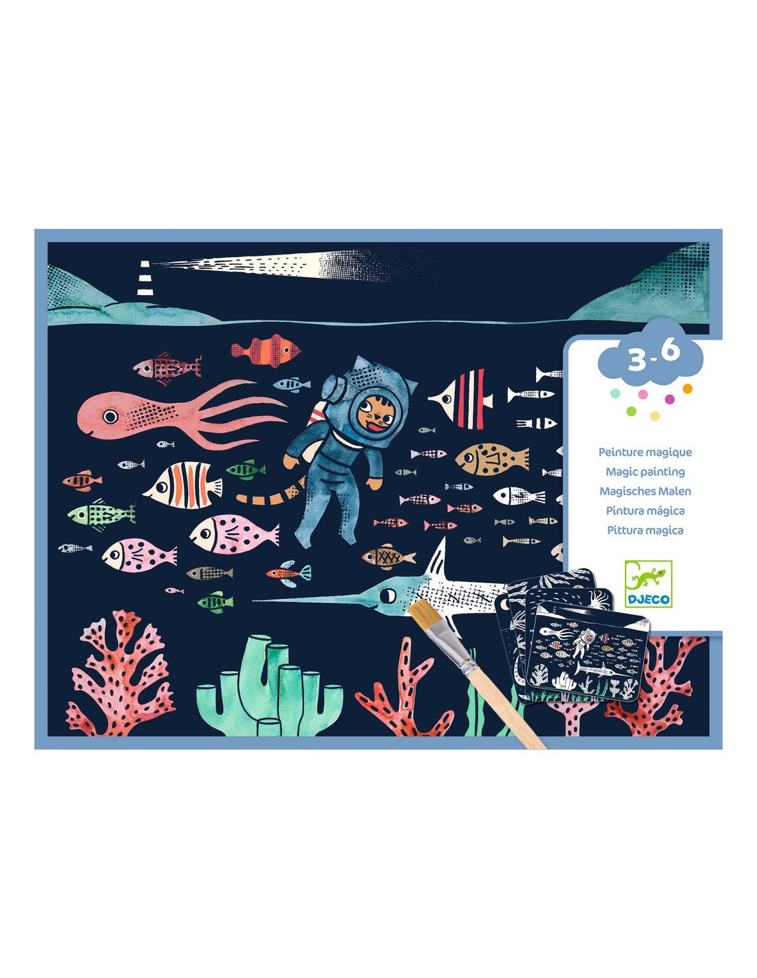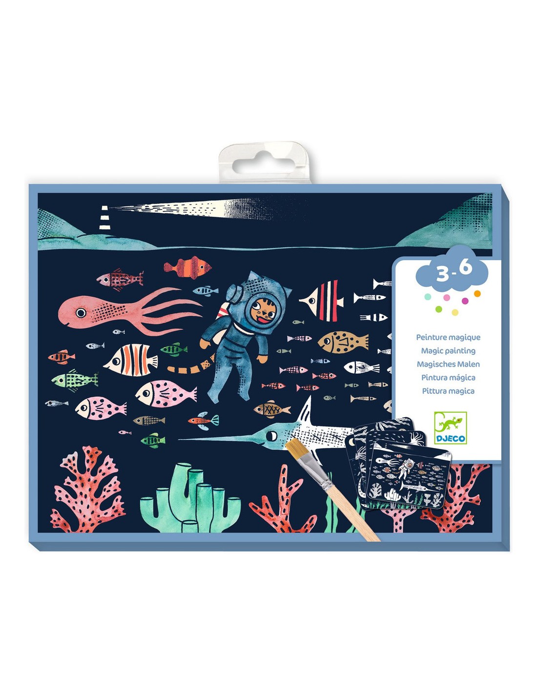 Contenu : 4 planches à peindre, un petit pinceau en bois et 1 livret.