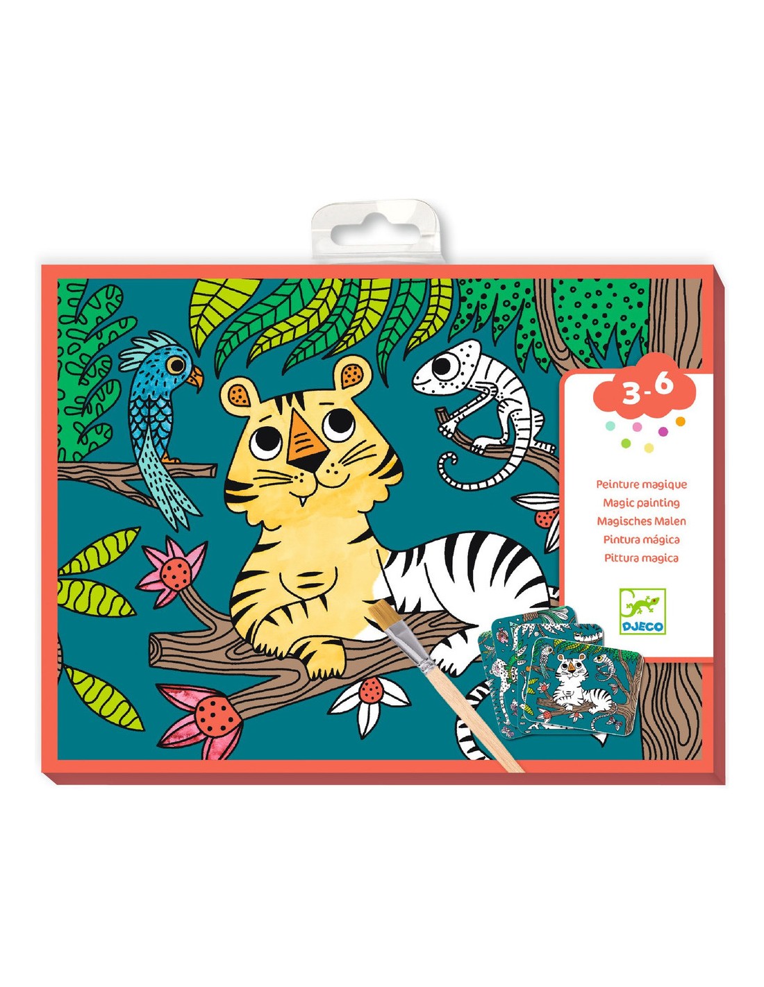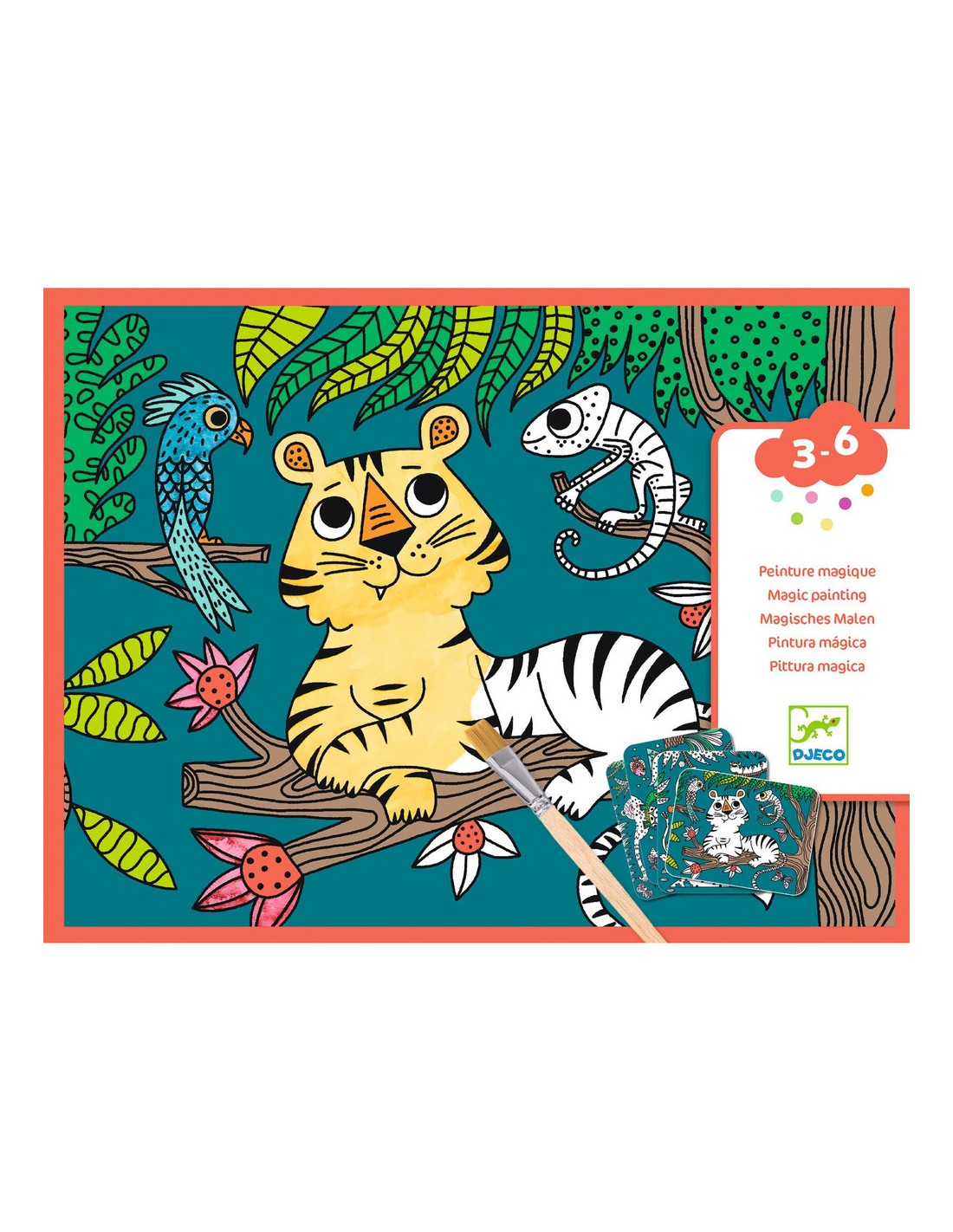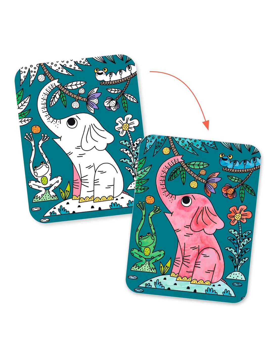 Avec seulement deux gouttes d’eau sur le pinceau en bois, les illustrations se colorent comme par magie ! Les zones noires, imprimées avec une peinture spéciale, changent instantanément de couleur au contact de l’eau : un procédé original, propre et fascinant pour les enfants. Facile à mettre en place, guidée grâce au vernis qui limite les débordements, cette activité propose tout le matériel nécessaire pour créer de jolis tableaux… sans salissures ni matériel encombrant.