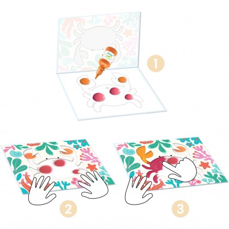 Contenu : 4 pochettes illustrées, plastifiées et lavables, 4 bouteilles de gouache (rouge, orange, bleu, vert) et 1 livret explicatif pas-à-pas.