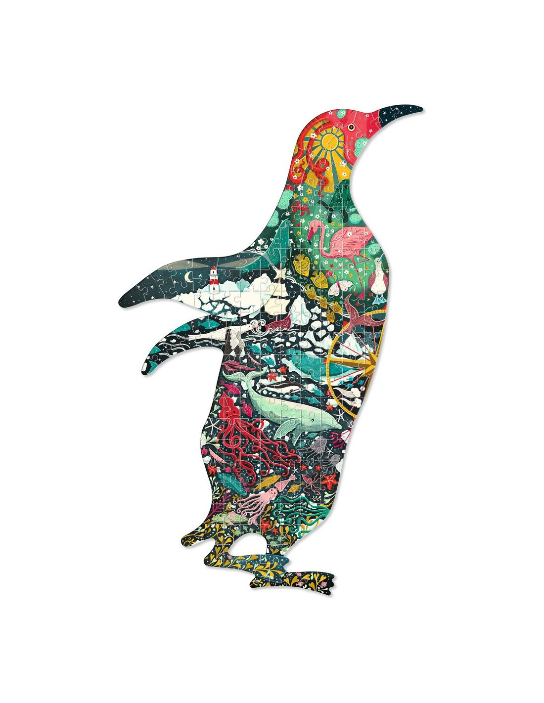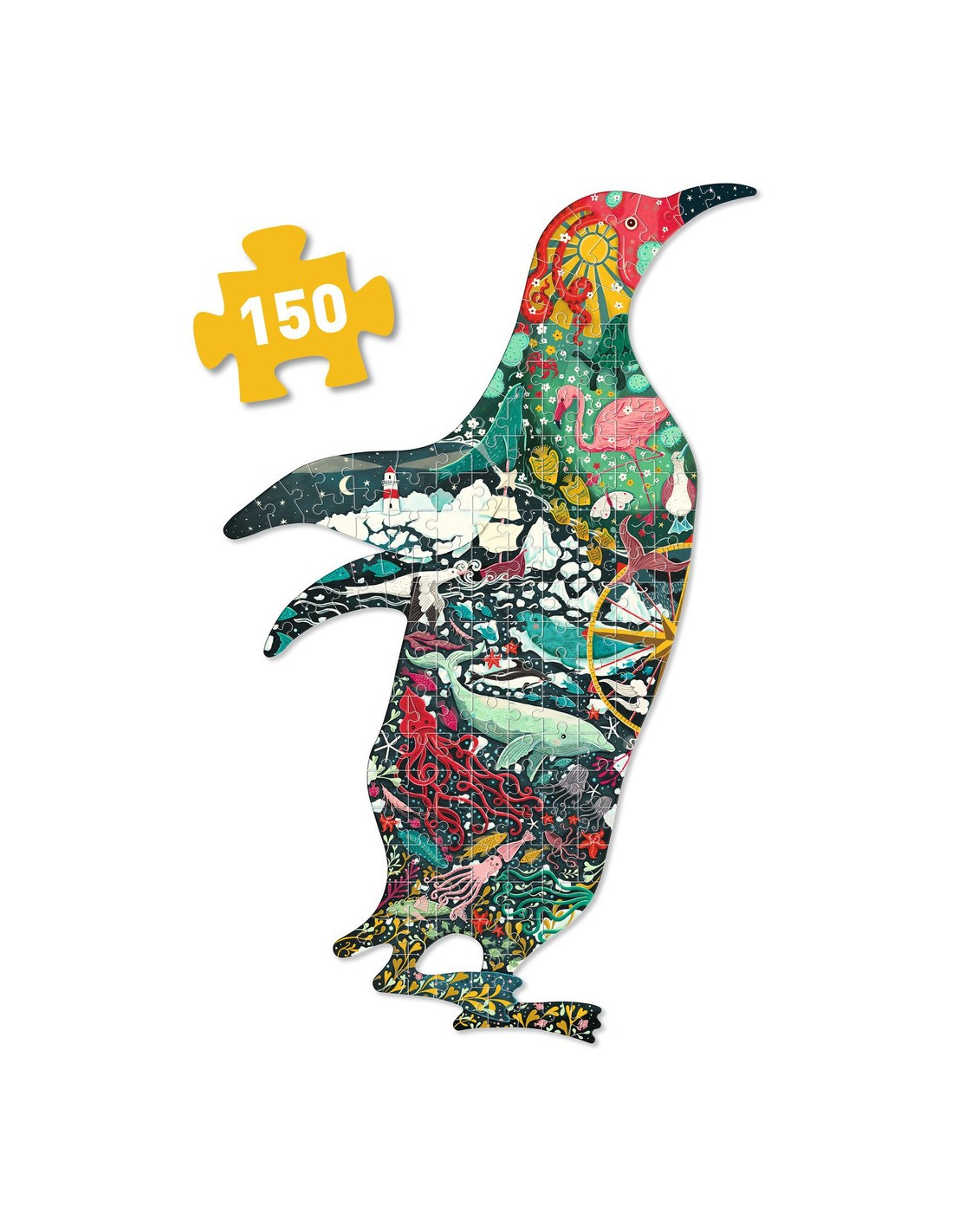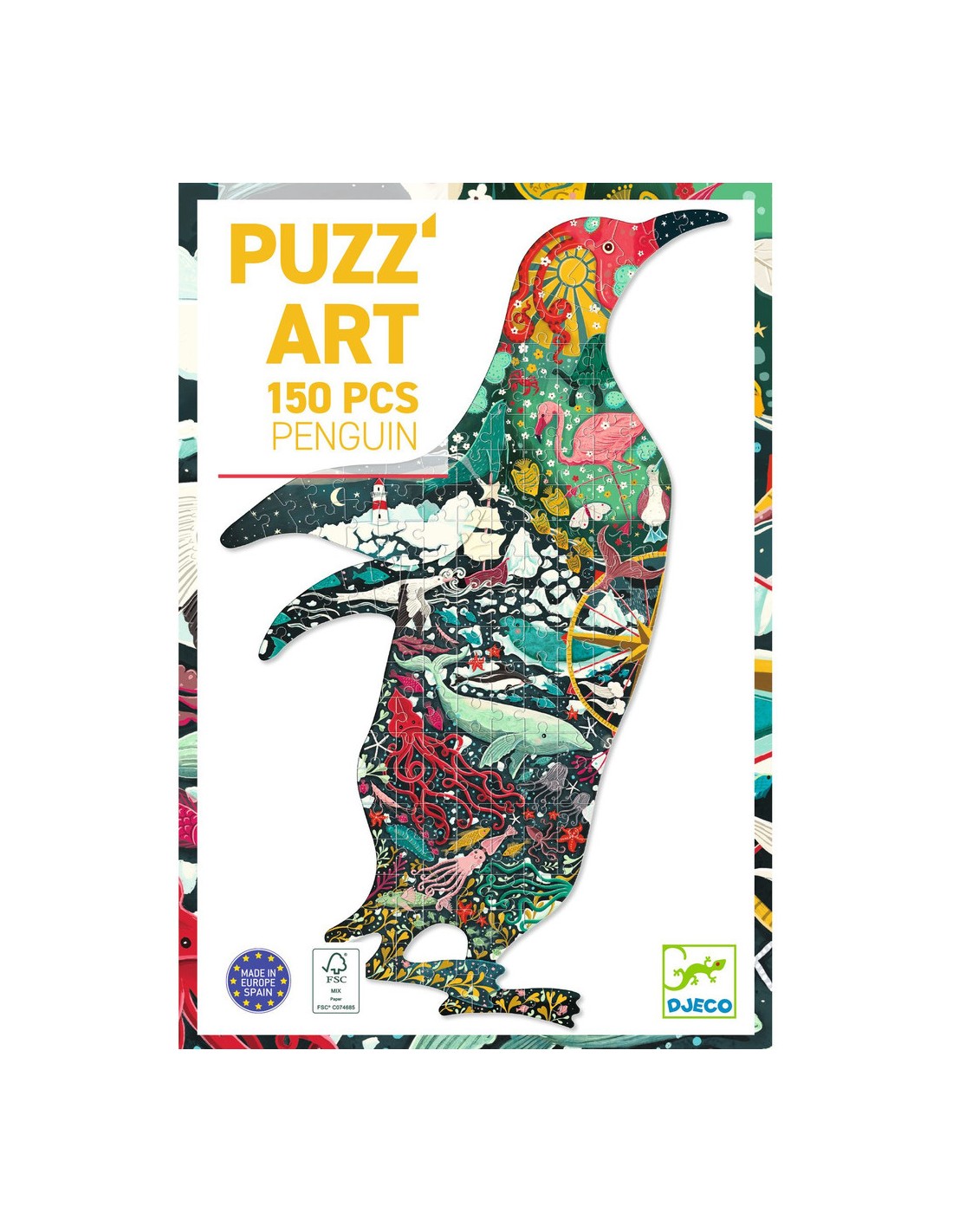 Le Puzz'Art Penguin est un puzzle de 150 pièces. Dans un format inédit, sans coin ni bordure, tout l'art du puzzle est bousculé. L'enfant découvre à travers cette grande silhouette ajourée un manchot, dans lequel fourmille un monde imaginaire.