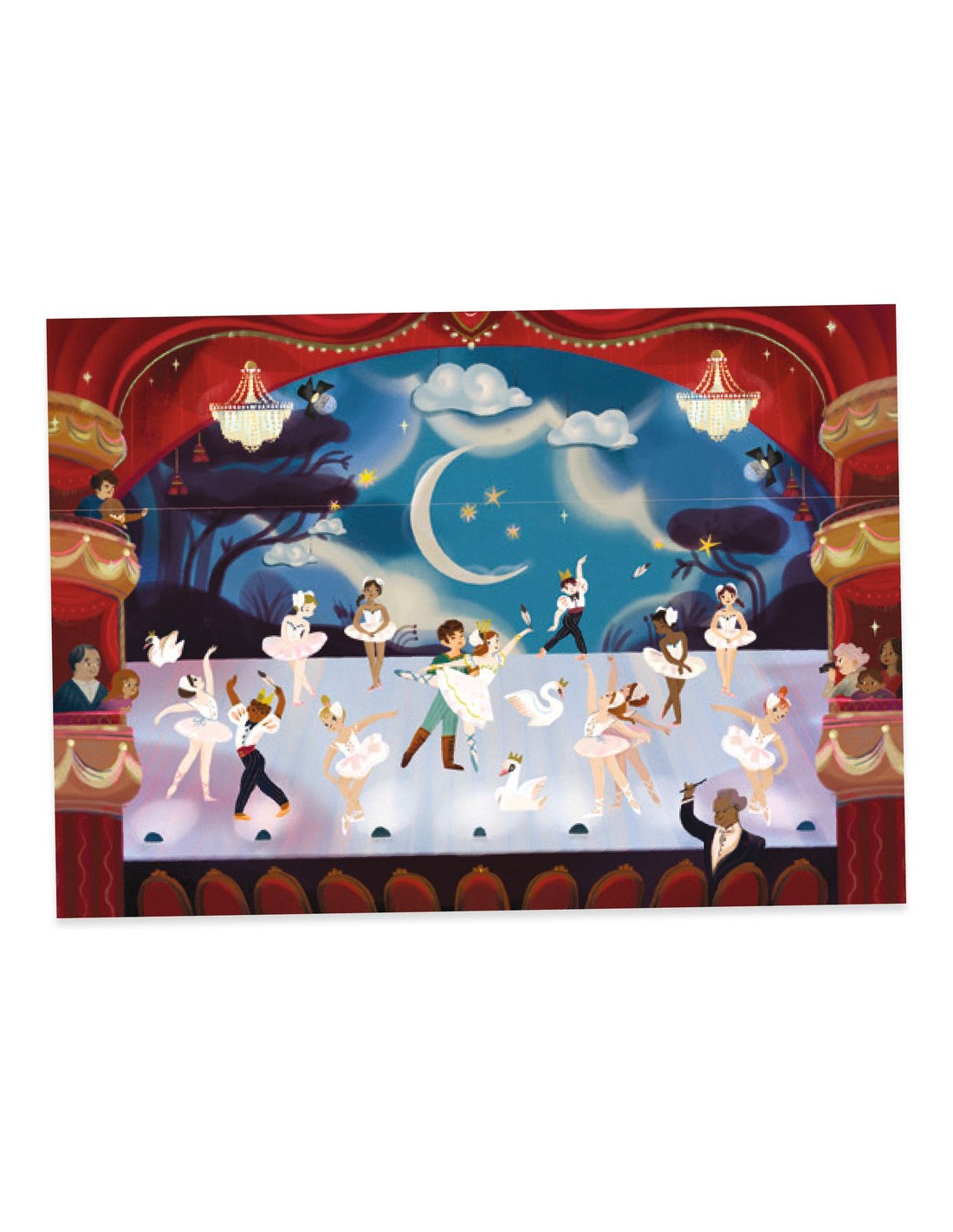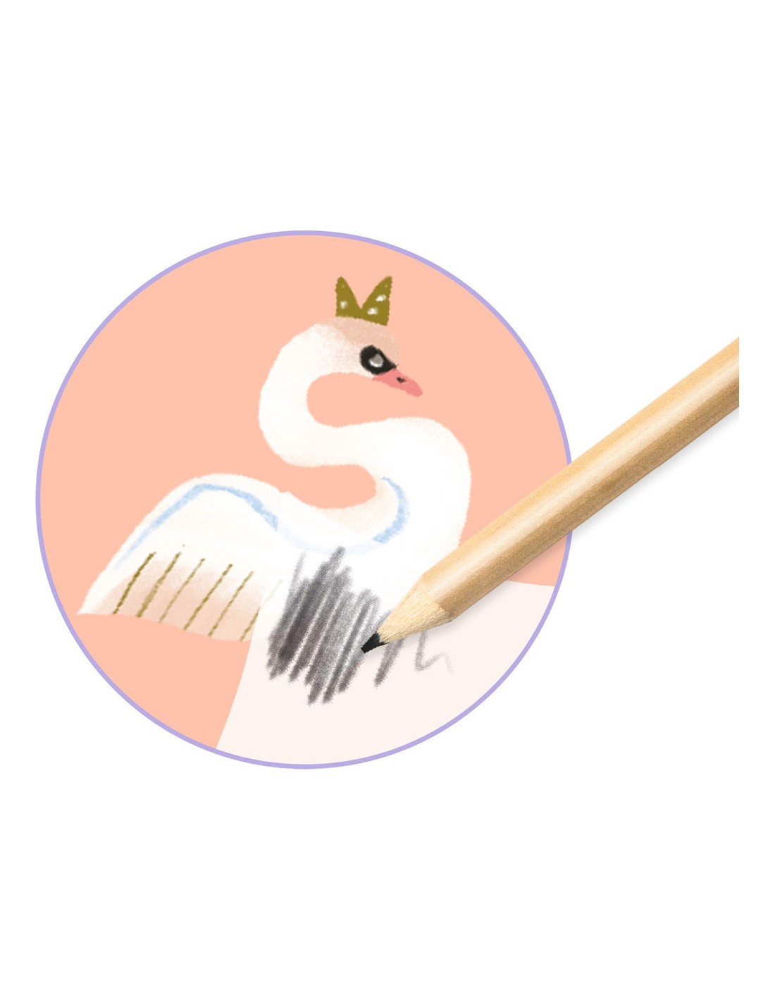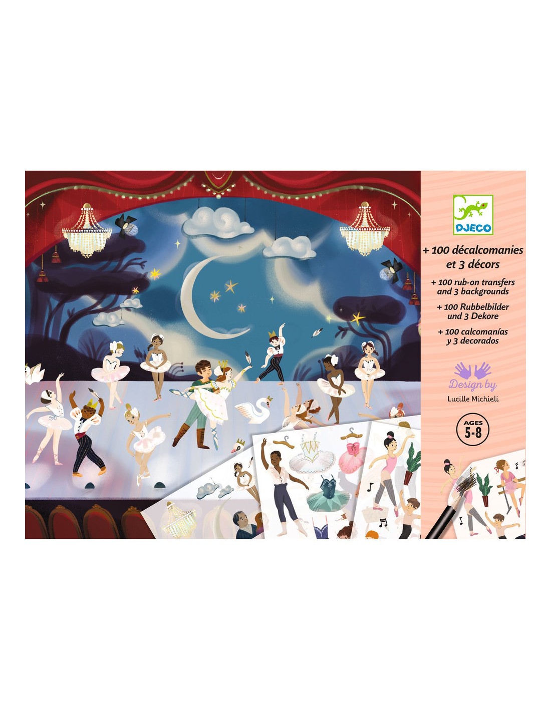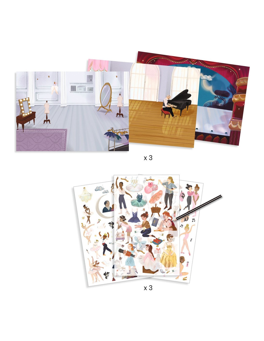 Une grande pochette contenant une multitude de décalcomanies et 3 grands fonds illustrés à compléter sur le thème de la danse classique. Au cours de danse, dans l'atelier des tutus ou sur scène, l’enfant choisit un décor et positionne dessus les éléments à transférer. À l’aide d’un crayon, il frotte les images pour les déposer à l’endroit choisi.