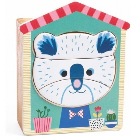 Découvrez le puzzle en bois Face mix de Djeco, vous devez reconstituer 5 frimousses de mignons animaux colorés. Chaque visage se compose de 3 pièces, vous devez refaire les visages de différents animaux sur une jolie boite en bois en forme de maison, un blaireau, un ours, un chat, un koala, un tigre et un cochon.