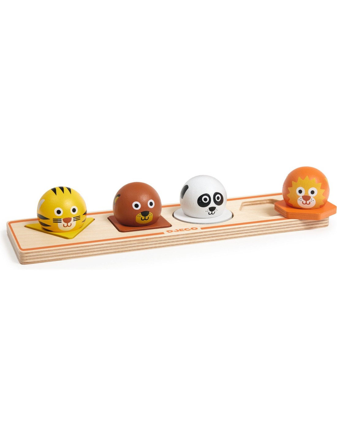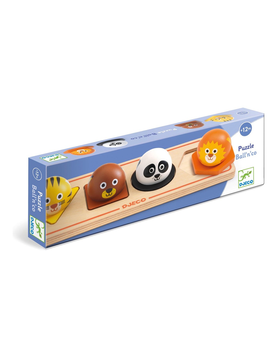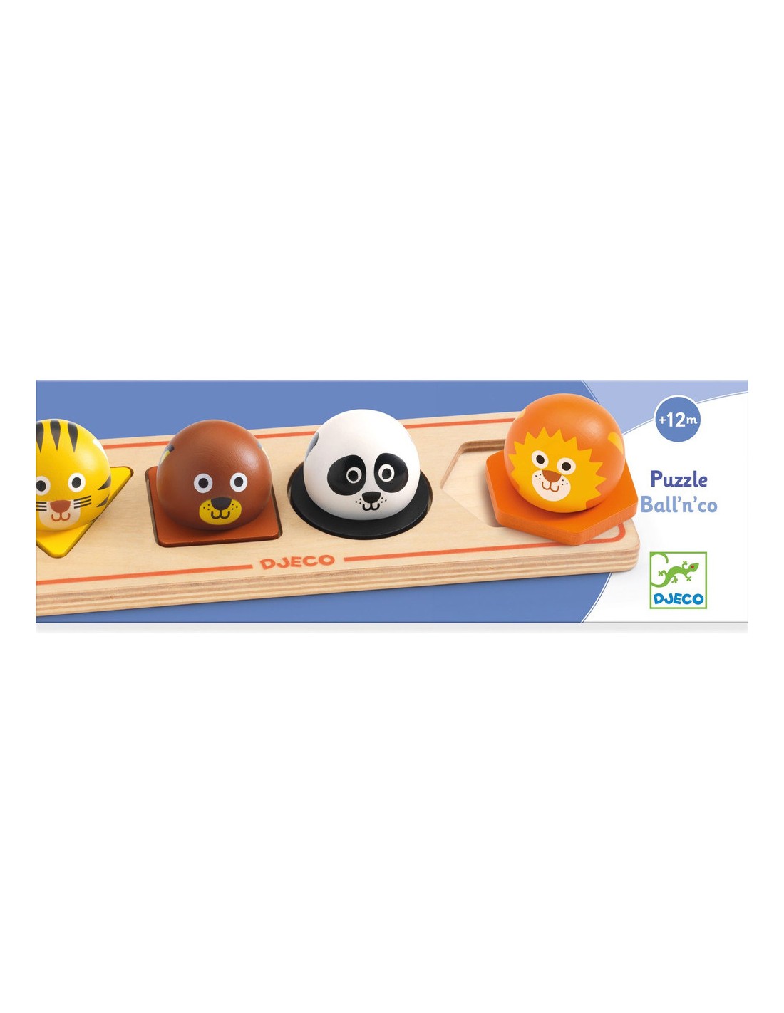 Ball’n’Co est un puzzle en bois facile à manipuler sur le thème des animaux sauvages : les pièces du puzzle surmontées de têtes d’animaux toutes rondes facilitent la préhension par les petites mains. L’enfant place les pièces en reconnaissant sur le plateau les formes géométriques.