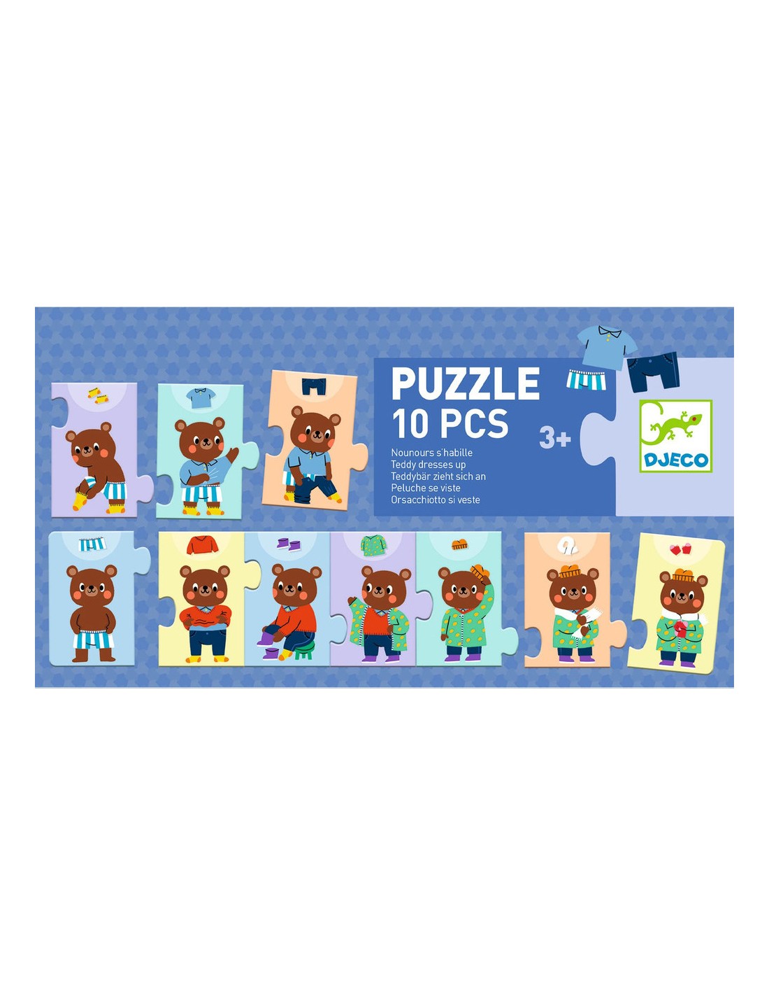 Nounours s'habille est un puzzle frise de 10 pièces à remettre dans l'ordre pour apprendre les étapes de l'habillement.
