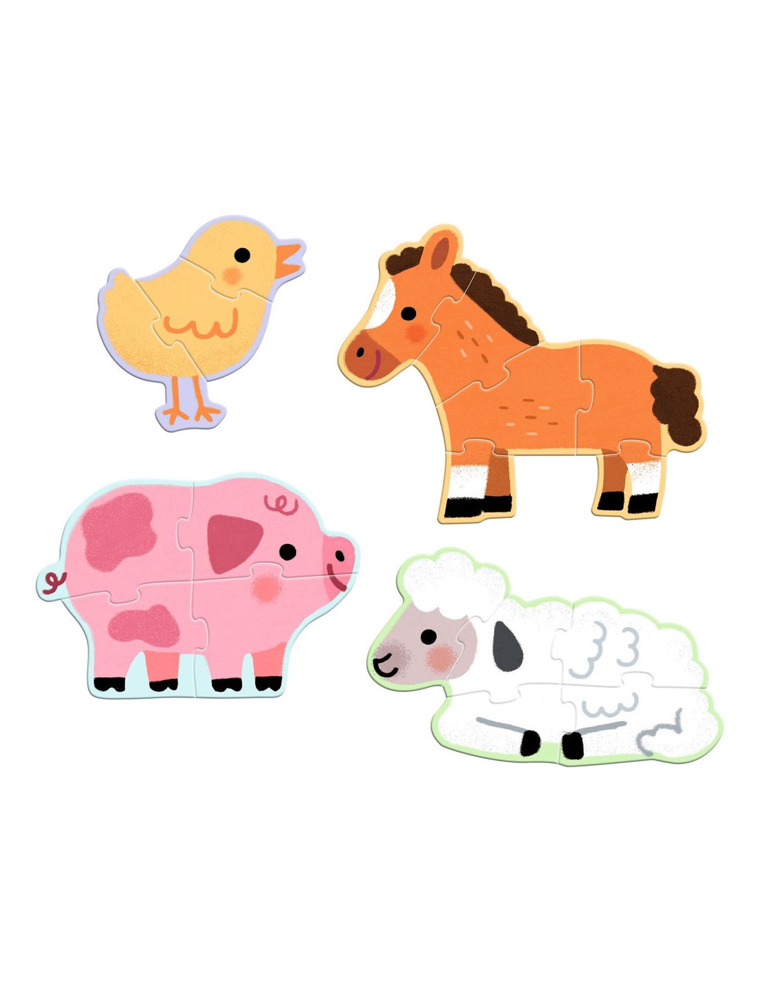 Puzzle Primo "À la ferme" comprend 4 puzzles évolutifs et silhouettés de difficulté croissante, sur le thème des animaux. Ces puzzles sont spécialement conçus pour les plus petits, à partir de 2 ans.