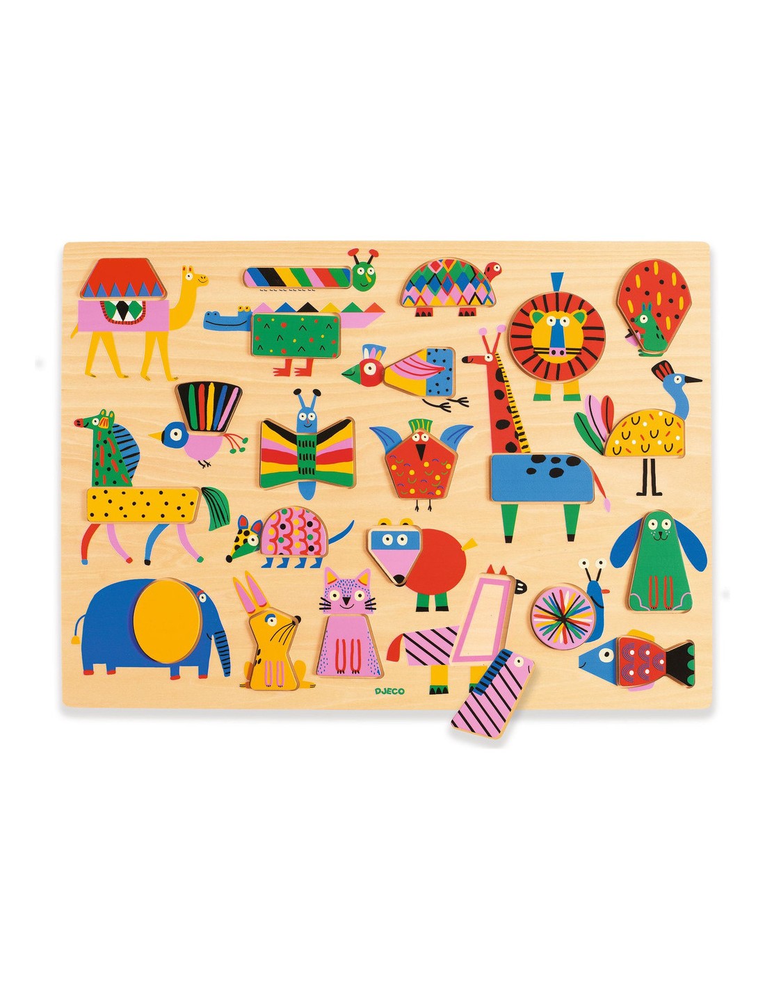 Un puzzle en bois sur le thème des animaux et des formes géométriques. L’enfant place les 22 pièces en reconnaissant sur le plateau les formes géométriques.