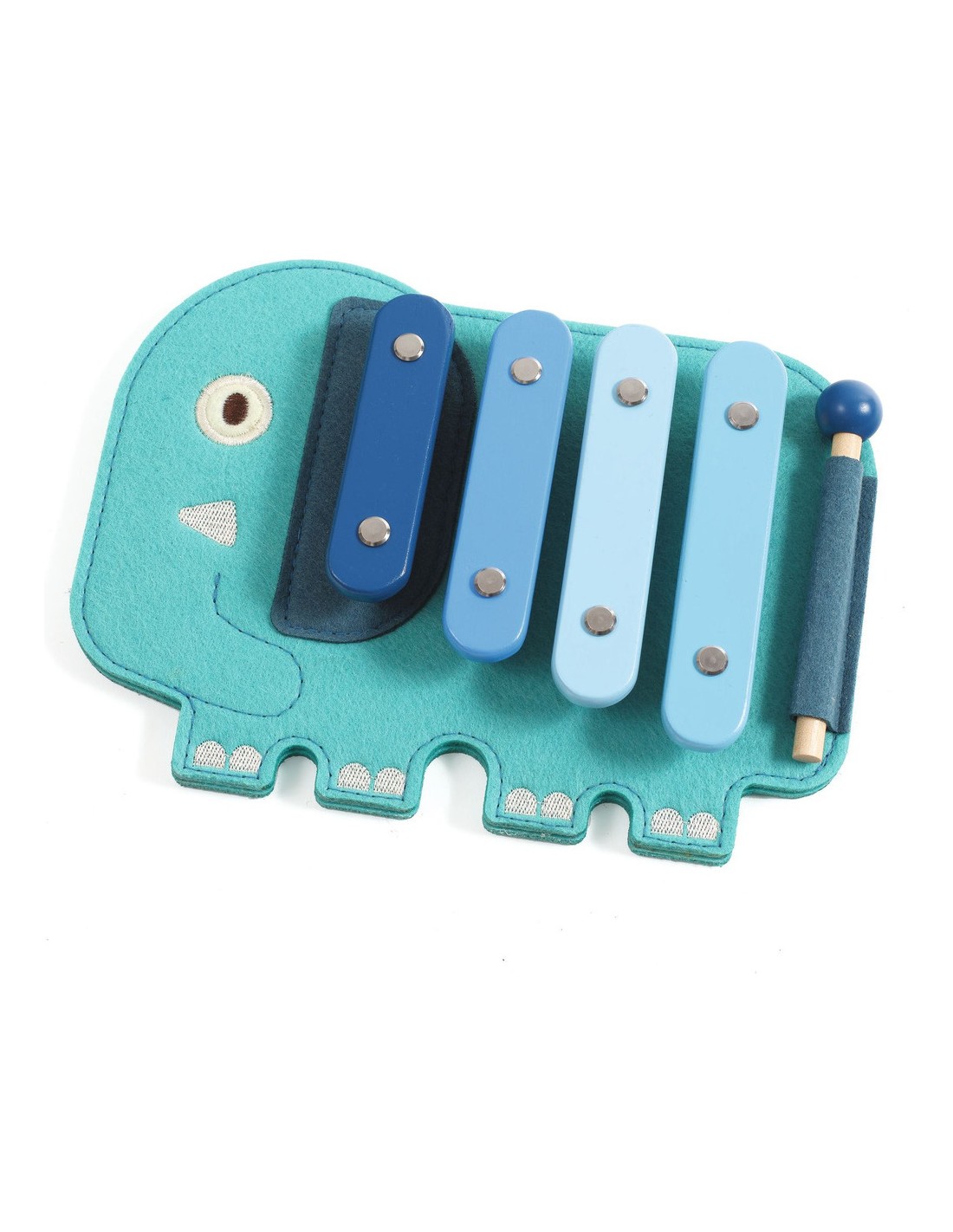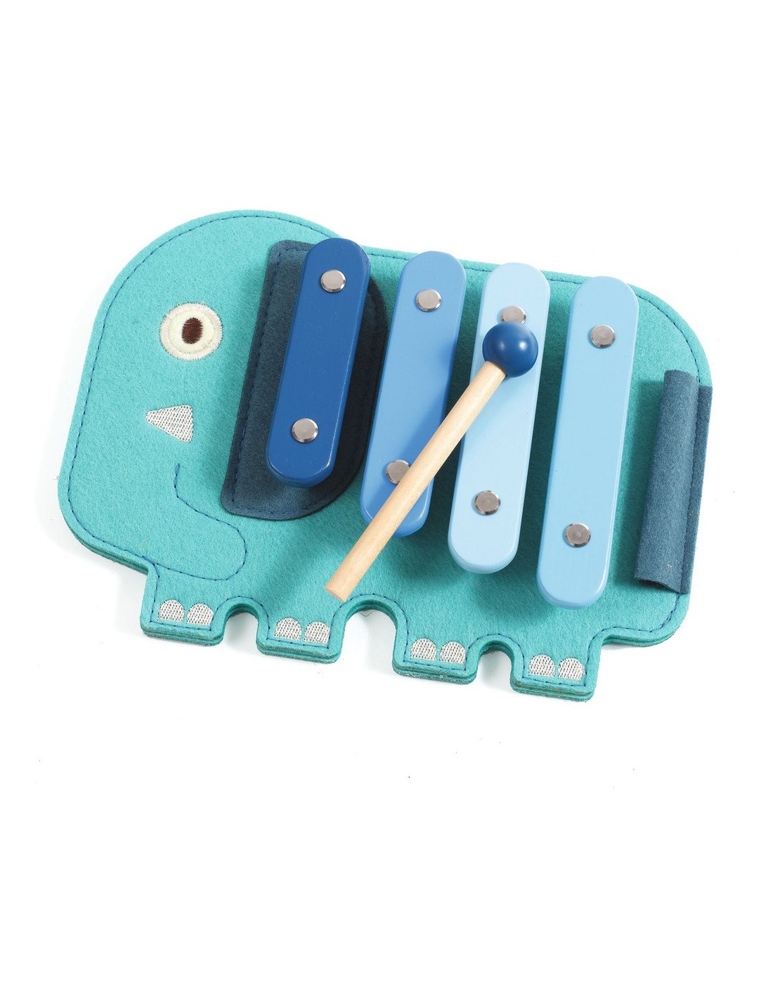Un xylophone en bois et feutrine en forme d’éléphant, aux couleurs vives et adapté aux petites mains des tout-petits. L’enfant utilise la baguette en bois pour jouer les 4 notes et découvrir ses premières mélodies. La feutrine apporte douceur et volume tout en restant légère, pour un premier instrument à la fois ludique et sensoriel.
