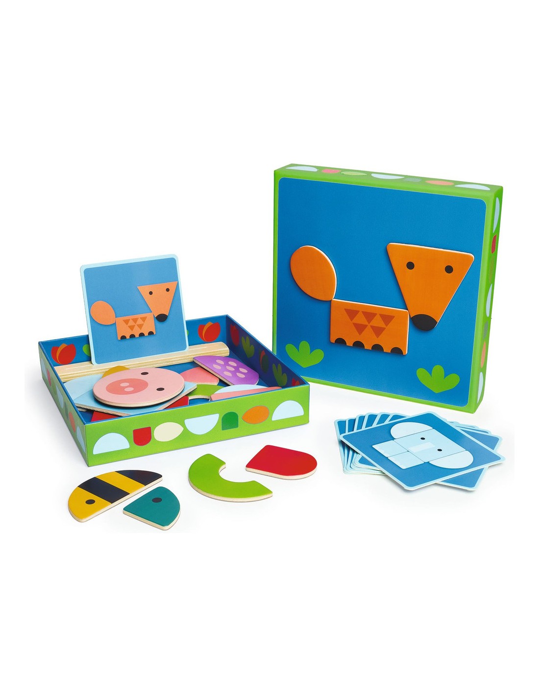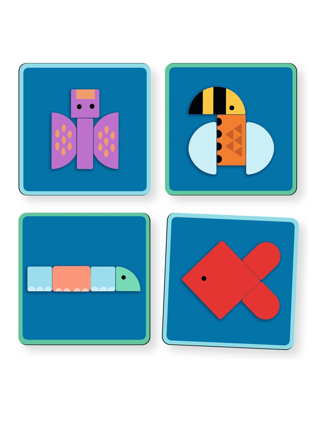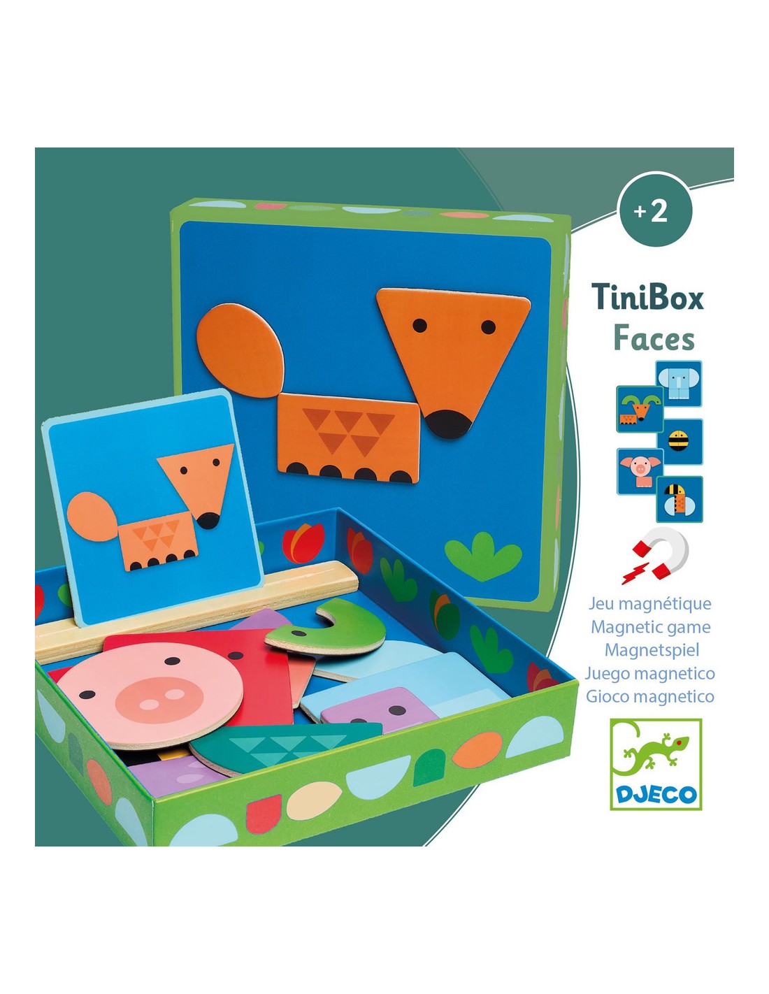 Une jolie boîte en carton à revêtement spécial, pensée pour jouer directement sur sa face grâce aux magnets en bois. L’enfant s’amuse à reproduire les 16 animaux, en manipulant de grandes pièces magnétiques adaptées aux petites mains. Un jeu pratique à emporter partout : toutes les pièces et cartes se rangent facilement dans la boîte une fois la partie terminée !