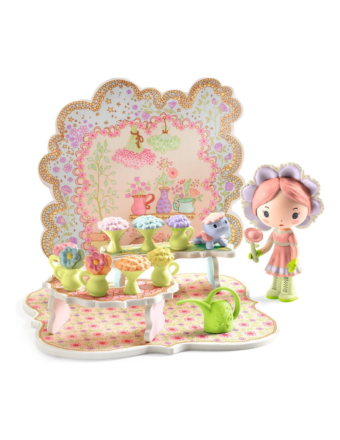 Contenu : 1 figurine + 1 compagnon + 1 arrosoir + 8 bouquets + 1 fleur + 2 pcs en carton imprimé dont 1 élément de décor monté sur un pion en bois + 2 étagères en carton imprimées collées et assemblées.