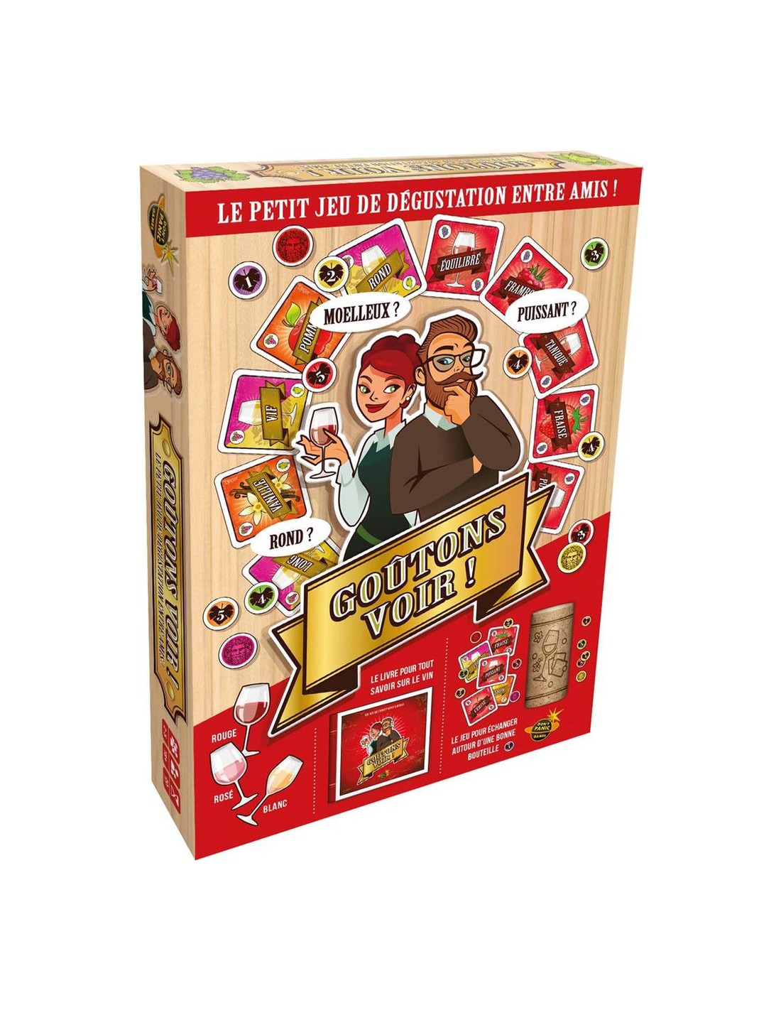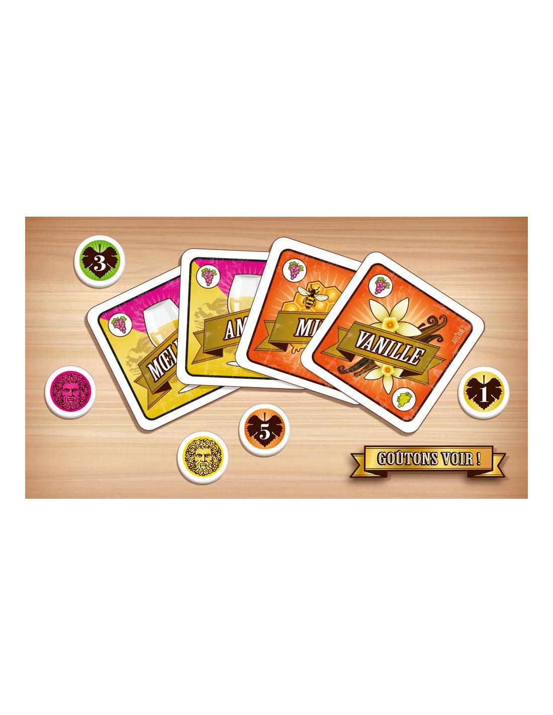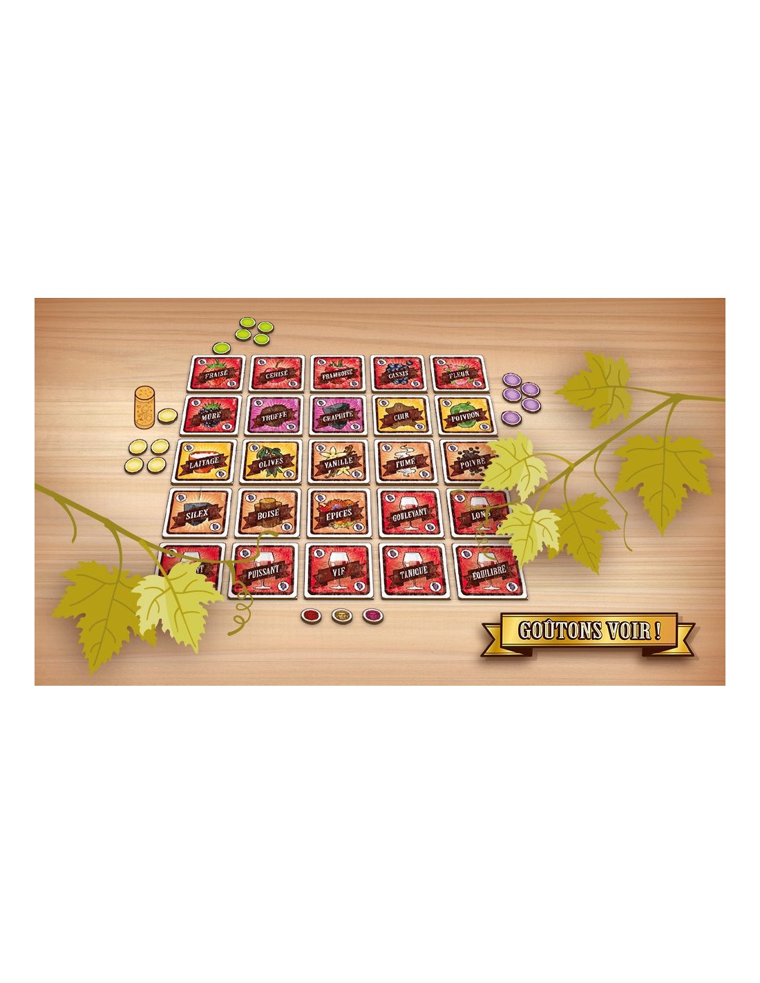 Goûtons voir ! est un jeu de société coopératif autour du vin et de la dégustation. Ici, pas besoin d’être sommelier ! Le but est de décrire, partager et comparer vos ressentis sur les arômes et les saveurs du vin, comme de véritables œnologues en herbe.