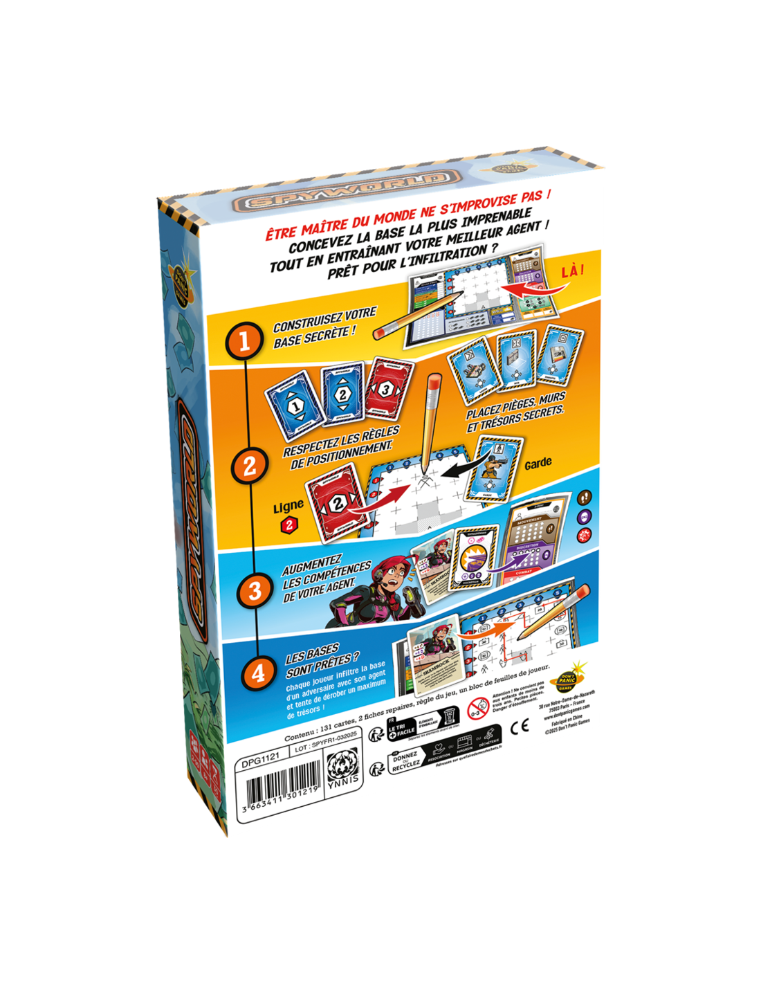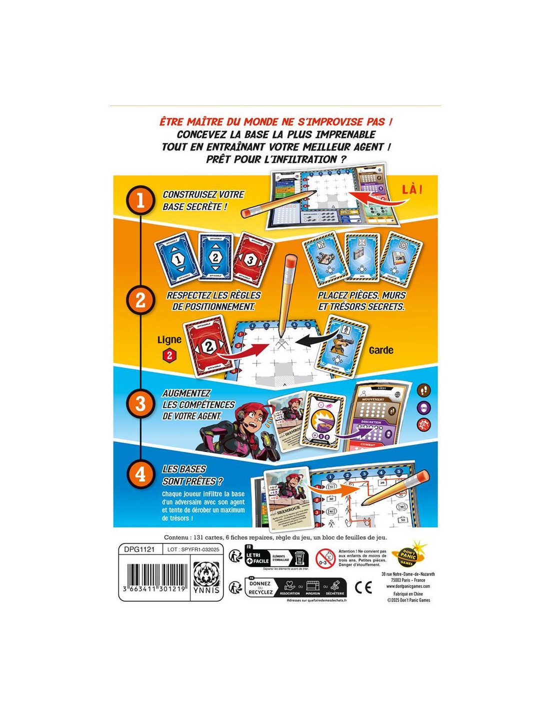 Avec des objectifs secrets, des gadgets uniques et plusieurs plateaux de difficulté croissante, Spyworld vous promet des heures de jeu. Sa mécanique stratégique en deux temps — construction puis infiltration — vous garantit des parties pleines de surprises ! Contenu :4 fiches repaire, 131 cartes, 1 bloc de feuilles de joueur, 1 livret de règles.
