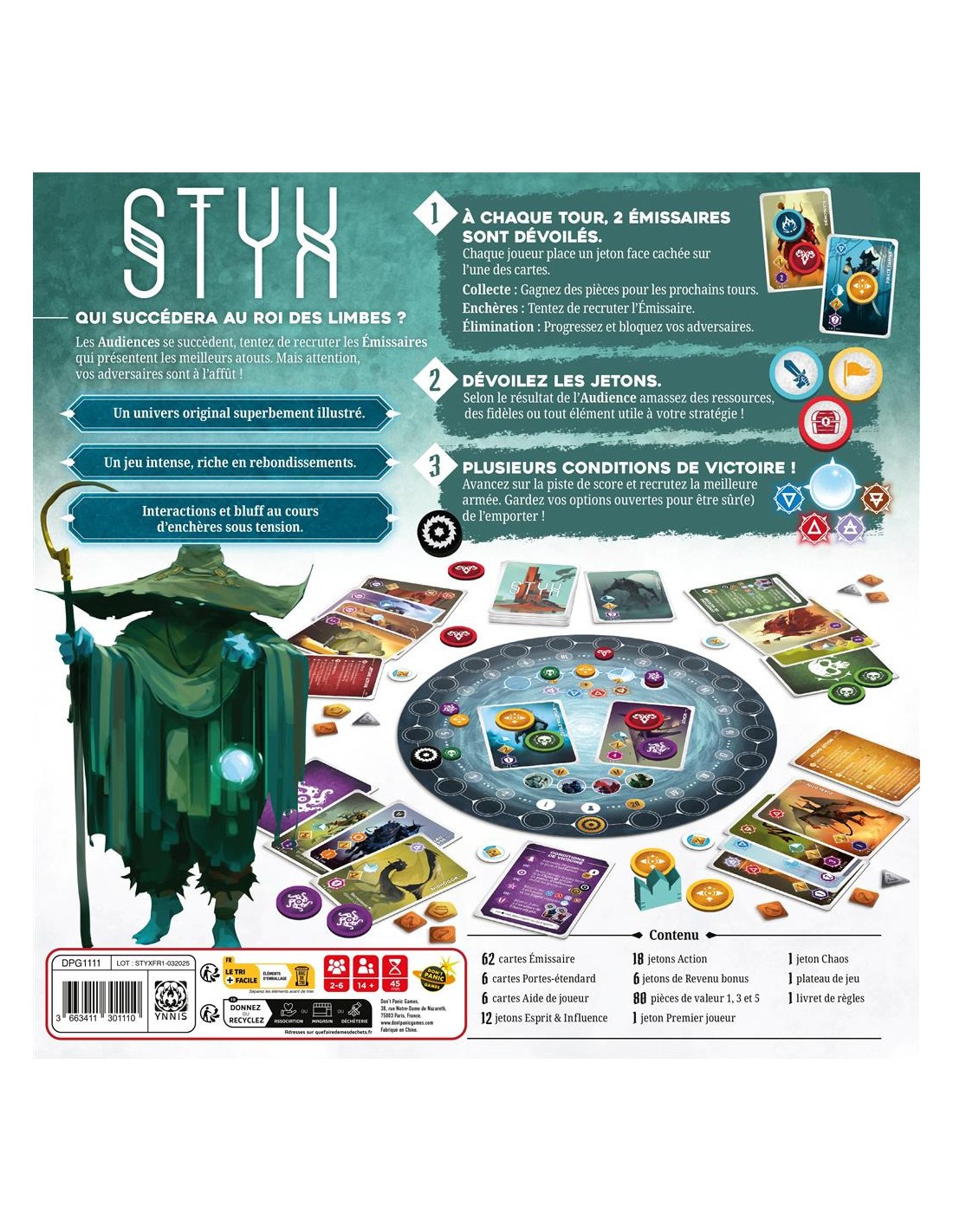 Dans le jeu Styx, chaque tour – appelé Audience – voit deux Émissaires se présenter. Les joueurs placent secrètement un jeton Action (Collecte, Recrutement ou Élimination) sur l’un d’eux. La Collecte rapporte de l’or pour les prochains tours, le Recrutement permet d’intégrer l’Émissaire à votre armée et de progresser sur la piste d’Influence, tandis que l’Élimination procure de l’Esprit et freine vos rivaux, tout en faisant avancer le Chaos.