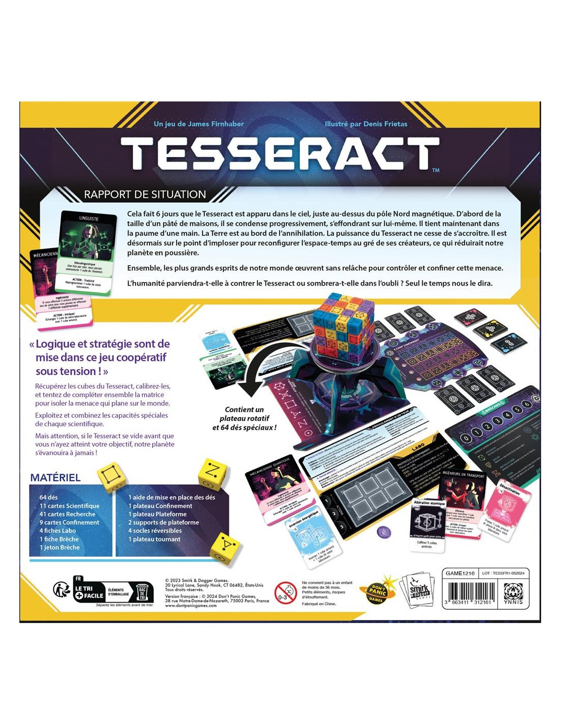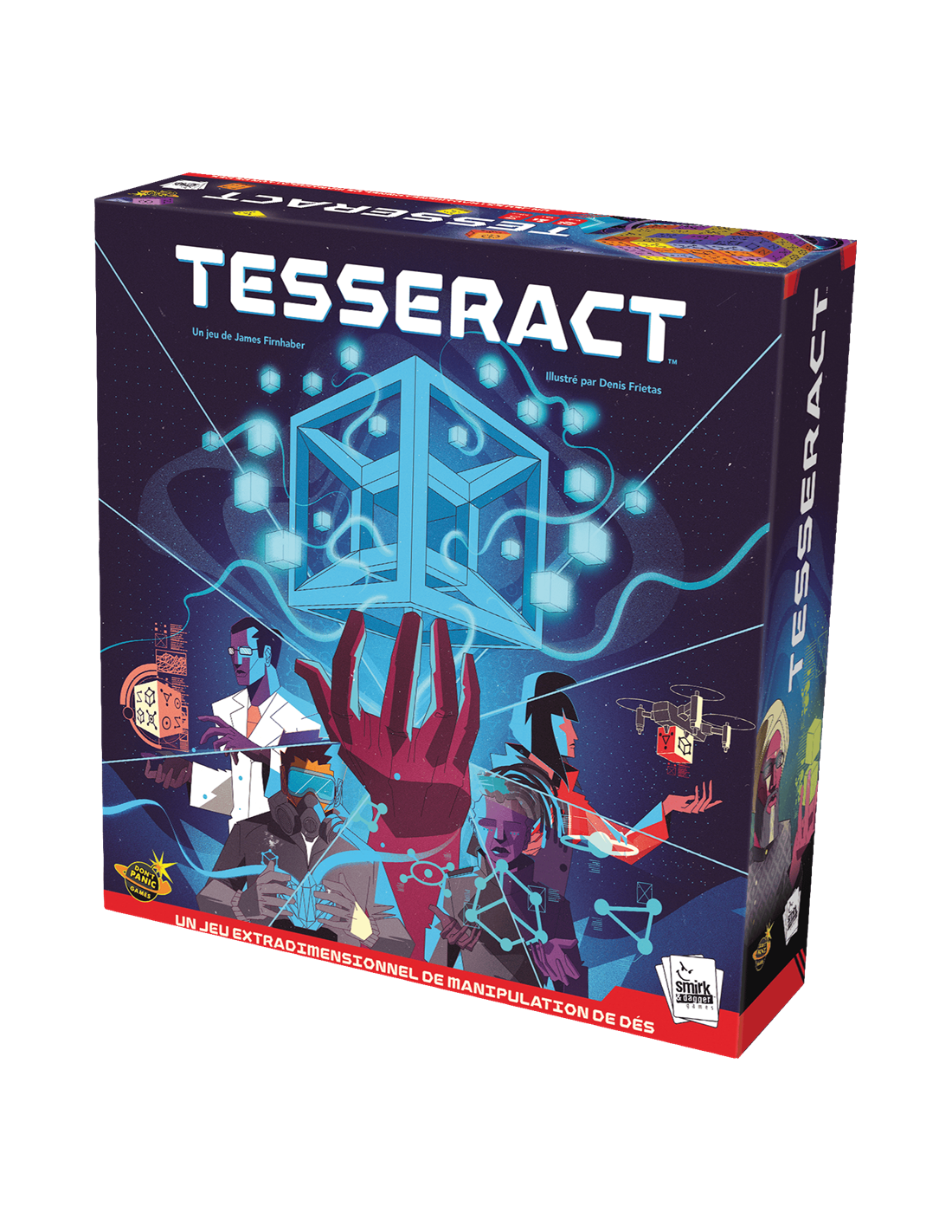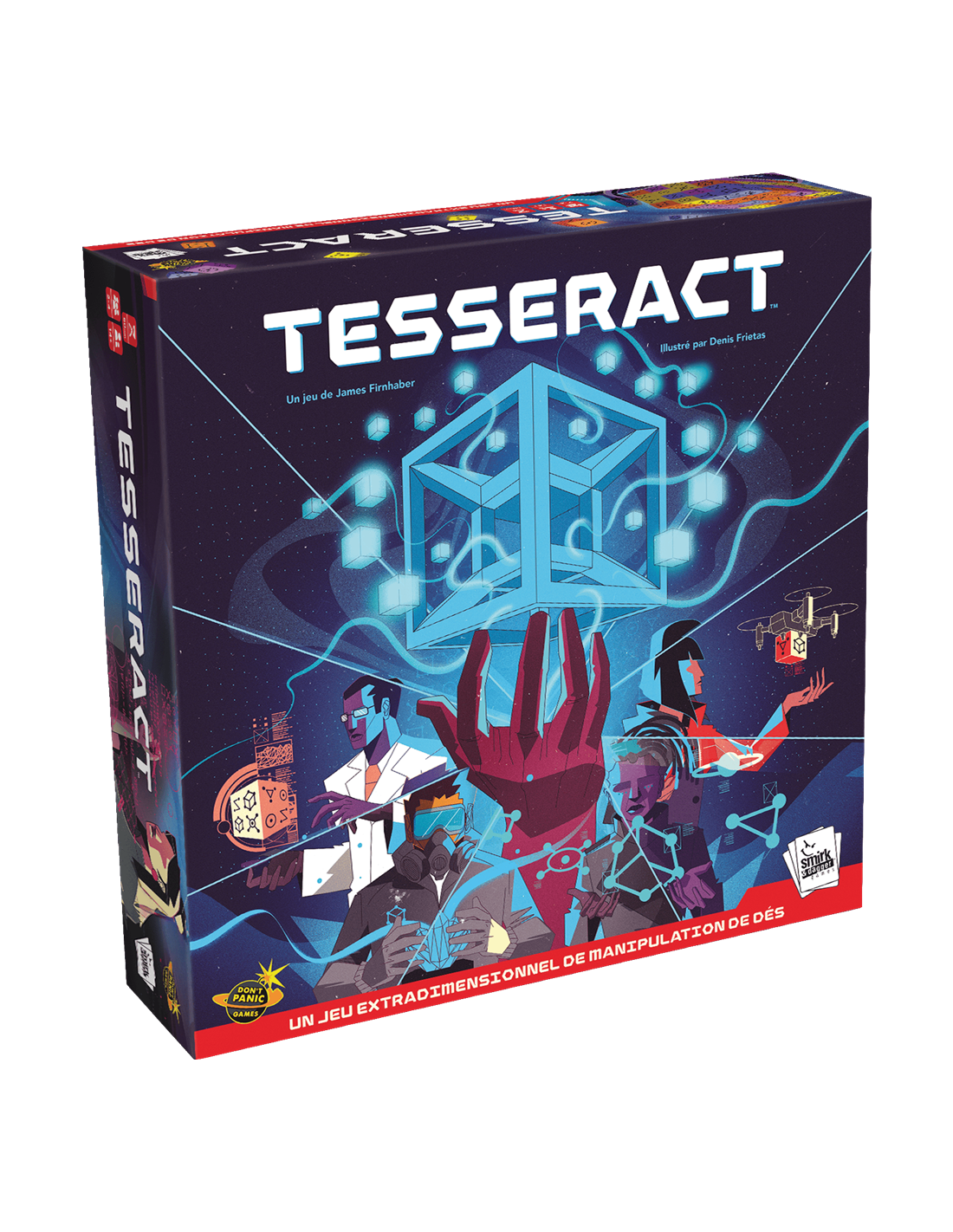 Tesseract est un jeu de manipulation de dés captivant et coopératif pour 1 à 4 joueurs. Le point central du jeu est un bloc de 64 dés, le Tesseract, qui se trouve au centre du plateau sur une plate-forme surélevée. Les joueurs retireront des cubes pour les placer dans leurs laboratoires individuels, les transféreront selon leurs besoins à d'autres, ajusteront les valeurs du cube et, surtout, isoleront les cubes dans la matrice de confinement, les neutralisant.