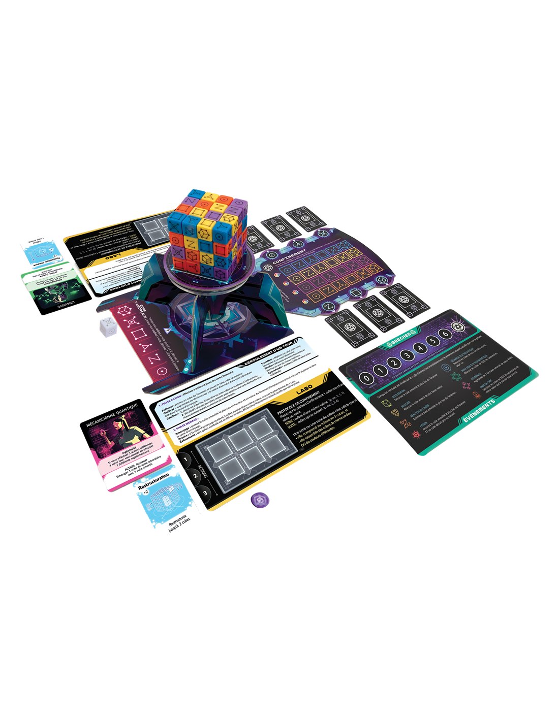 Pour contenir un cube, un joueur doit avoir dans son laboratoire 3 cubes ou plus, tous d'une même valeur (un ensemble) ou en séquence (une série), soit tous d'une même couleur, soit aucun de la même couleur. En remplissant complètement la matrice de confinement (24 dés uniques au total), ils arrêteront la réaction et gagneront la partie.