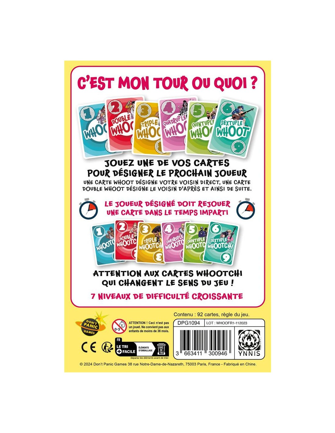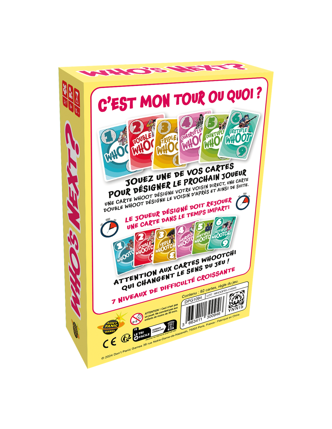 Dans Who's Next, jouez une de vos cartes pour désigner le prochain joueur. Une carte Whoot désigne votre voisin direct, une carte Double Whoot désigne le voisin d’après et ainsi de suite. Le joueur désigné doit rejouer une carte dans le temps imparti. Attention aux cartes Whootchi qui changent le sens du jeu !