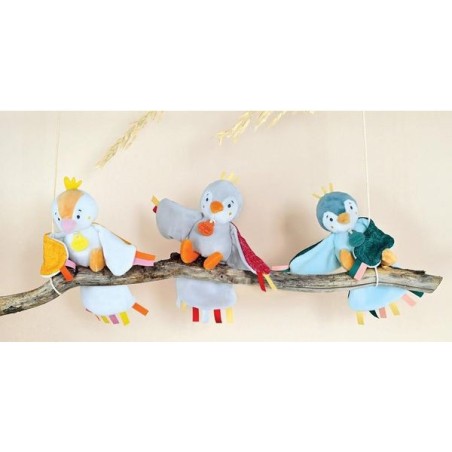 Les extrémités de ses ailes et de sa queue très souples ainsi que le sommet de sa tête sont garnis de petites étiquettes de couleurs, autant de détails à attraper et machouiller pour bébé. Très facile à manipuler et amusant avec son " cui cui" à volonté dès qu'on le secoue, ce Doudou oisillon est un cadeau parfait dès la naissance.