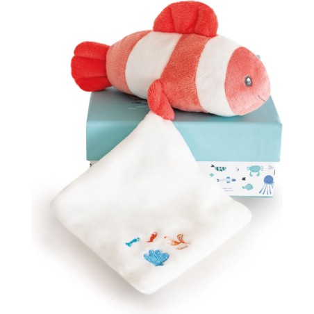 Amusant, ce petit doudou poisson clown corail, avec carré de tissu est présenté dans une jolie boîte, un cadeau idéal dès la naissance, pour tous les amoureux de la mer ou les bébés nageurs, Mon adorable doudou de la mer m'apaise, me fait rêver et stimule mon imaginaire !