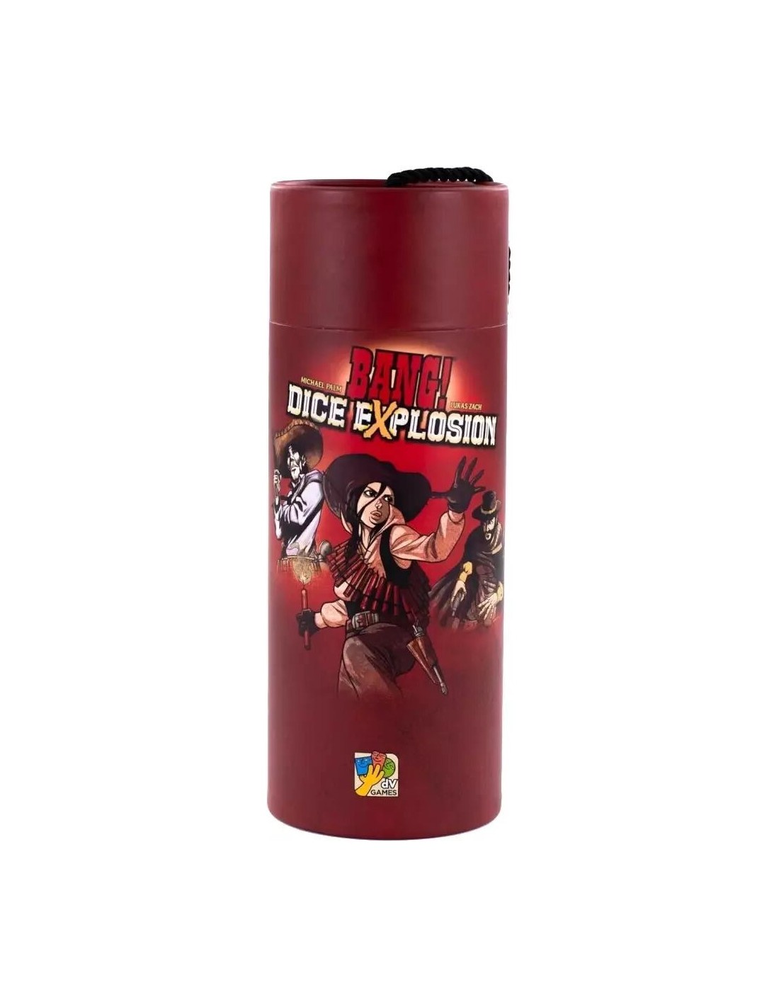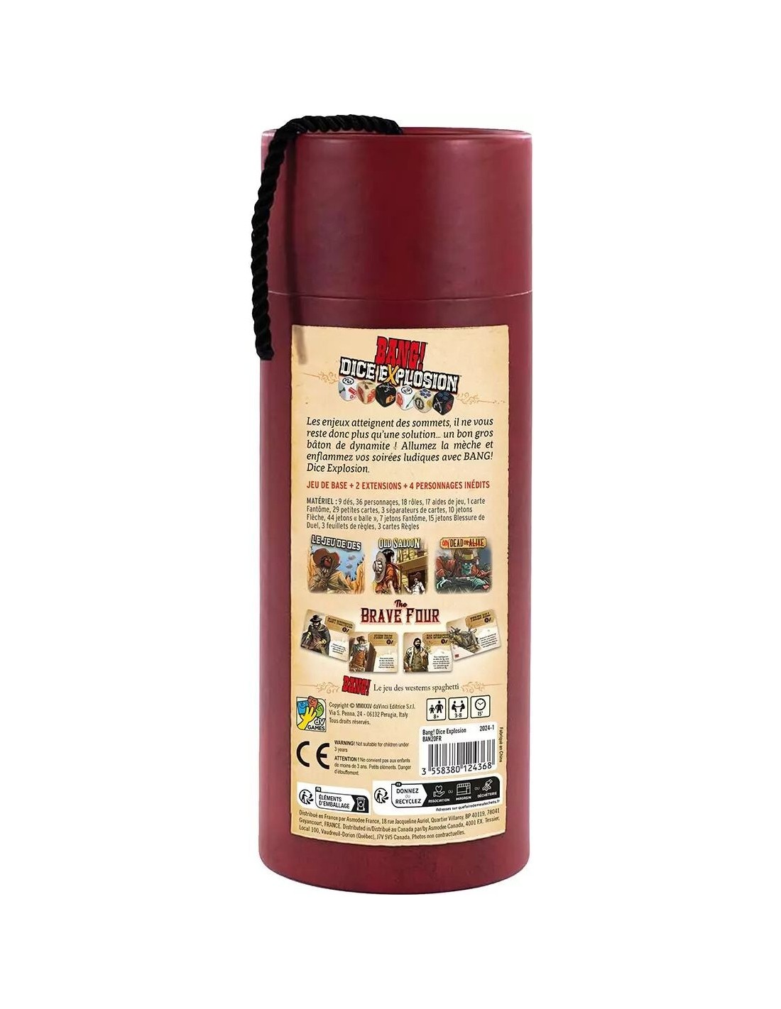 Une boîte tube évoquant un bâton de dynamite qui contient Bang le jeu de dés, ses deux extensions et du matériel supplémentaire !