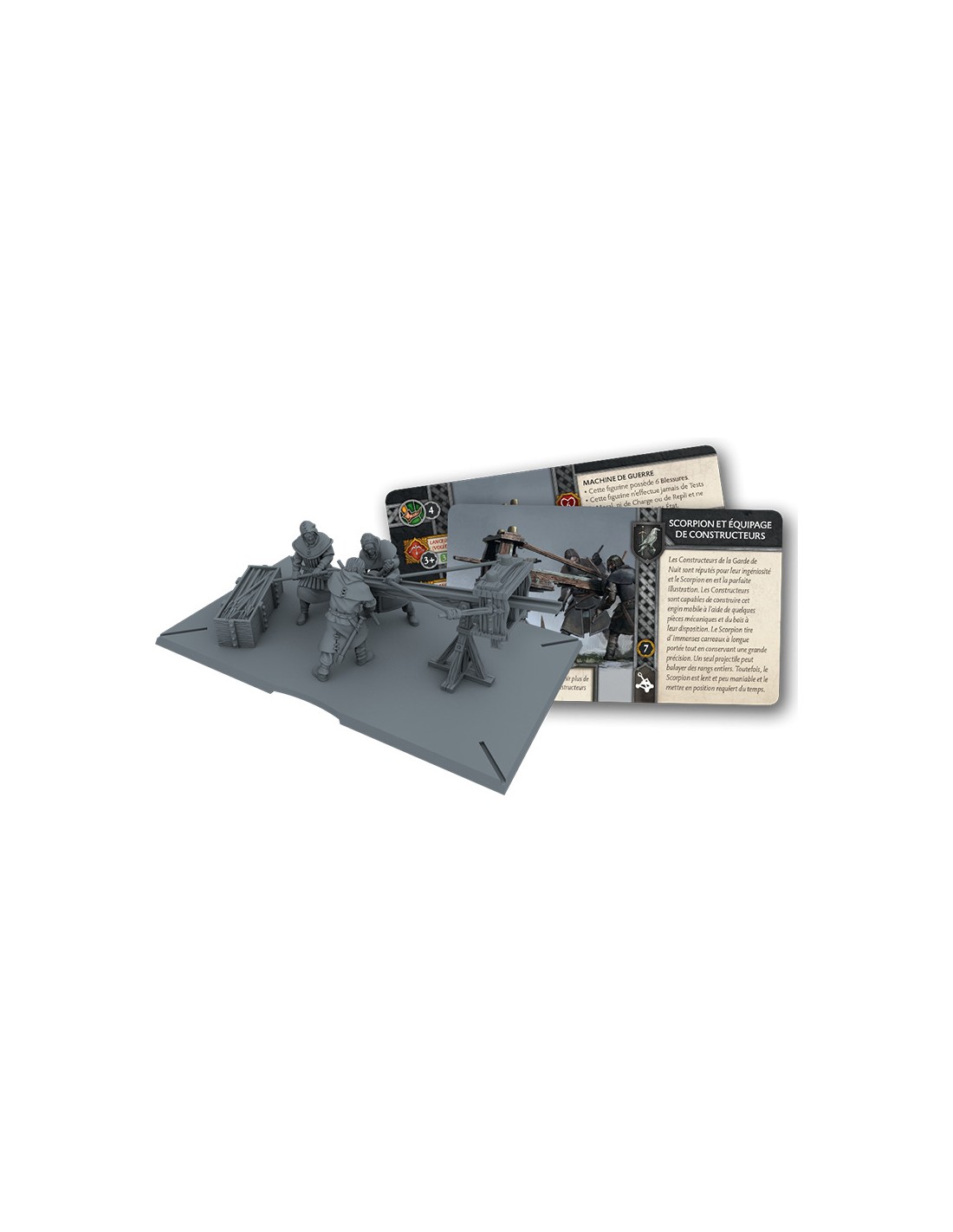 Les Constructeurs ont pour tâche de bâtir et d’assurer la maintenance des imposantes défenses de la Garde de Nuit, engins de siège compris. Bien que le Scorpion ne soit que le petit frère de la gigantesque baliste montée au sommet du Mur, il est toutefois capable de tirer un projectile de taille non négligeable à longue portée tout en conservant une précision mortelle. Il est simple à recharger et peut faucher des rangs entiers de troupes ennemies. En contrepartie, positionner un tel engin sur le champ de bataille n’est pas simple et le Scorpion demeure extrêmement vulnérable face à la cavalerie ou aux tirs.Dans Le Trône de Fer : Le Jeu de Figurines, les batailles épiques, les machinations politiques et les personnages légendaires de la célèbre saga de George R. R. Martin prennent vie sur votre table de jeu. À l’aide de magnifiques figurines pré-assemblées et de plateaux de déplacement, menez les armées et les héros des grandes Maisons de Westeros à la bataille et combattez pour le Trône de Fer au cours de nombreux modes de jeux uniques.