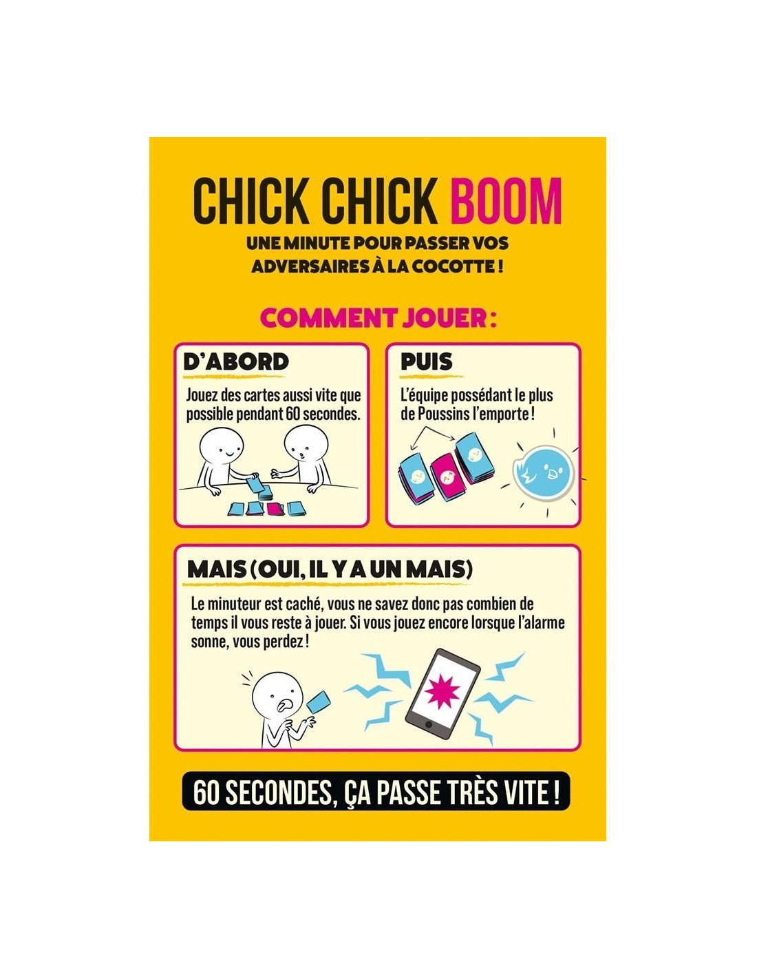 Chick Chick Boom est un jeu de cartes pour 2 équipes. À la fin de chaque manche, votre objectif est d’avoir plus de Poussins visibles que l’équipe adverse. Une manche ne dure que 60 secondes. Chaque équipe a 3 piles devant elle et une pioche de cartes à sa couleur (bleu ou rose).