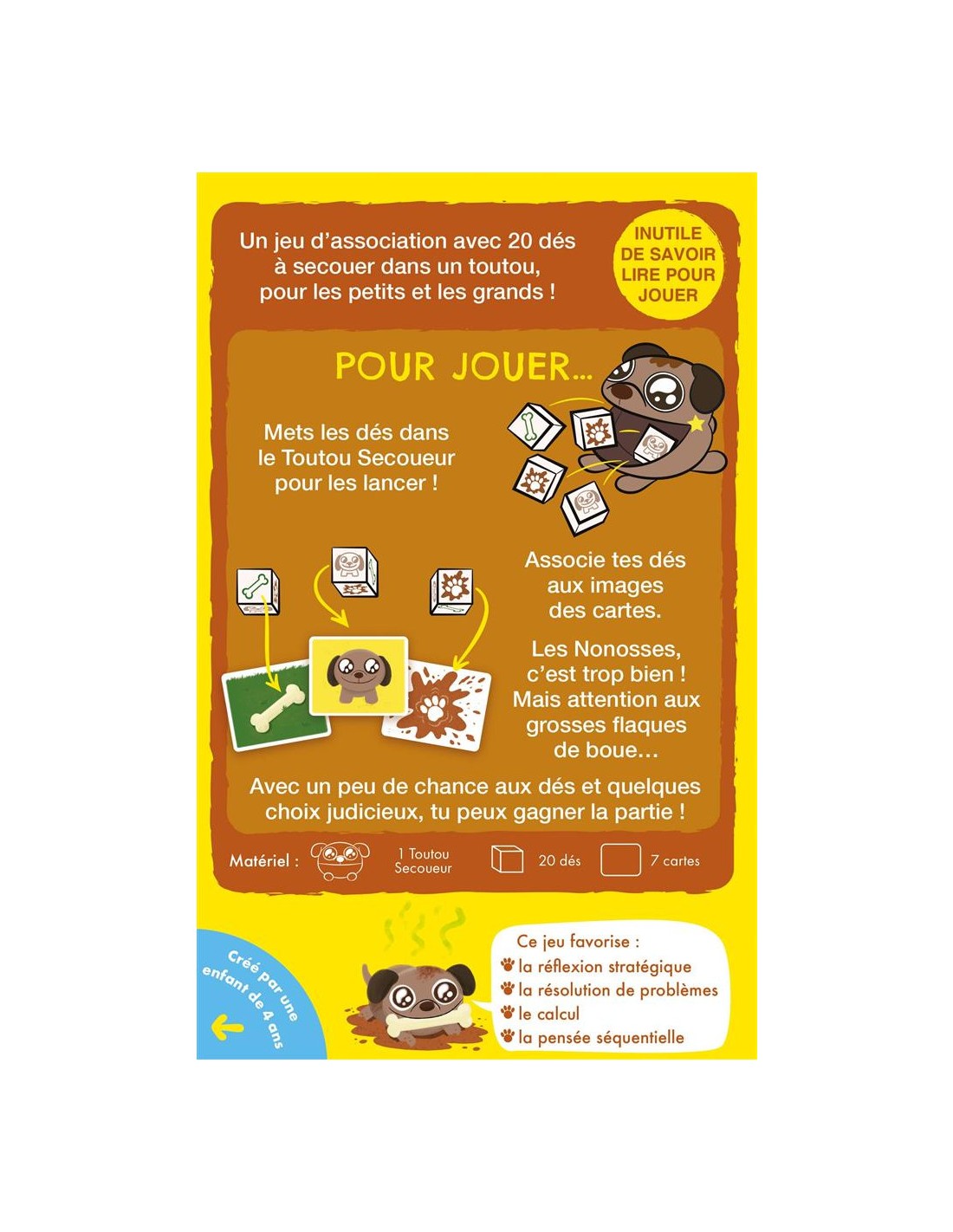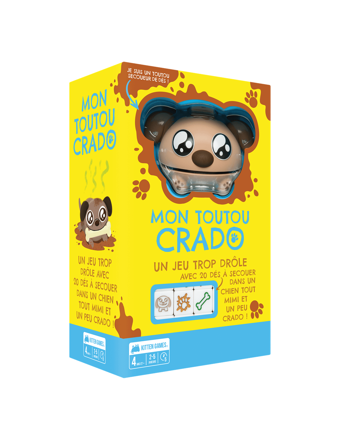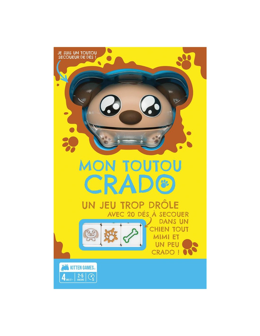Avec ses règles simples, ses rebondissements et son Doggy Shaker rigolo, Mon Toutou Crado séduira les enfants dès 4 ans,et les plus grands avec son format rapide et ses retournements imprévisibles. Contenu :Un doggy shaker, 20 dés, 7 cartes, 1 livret de règles