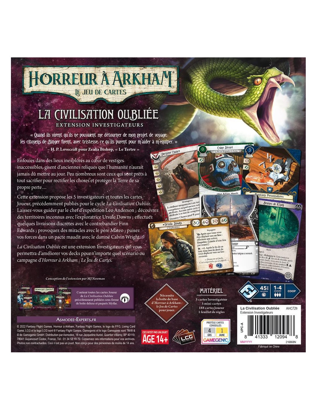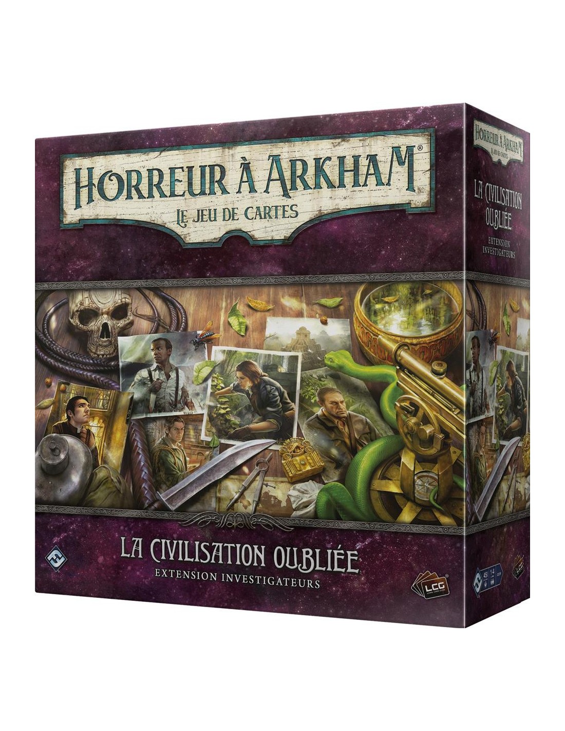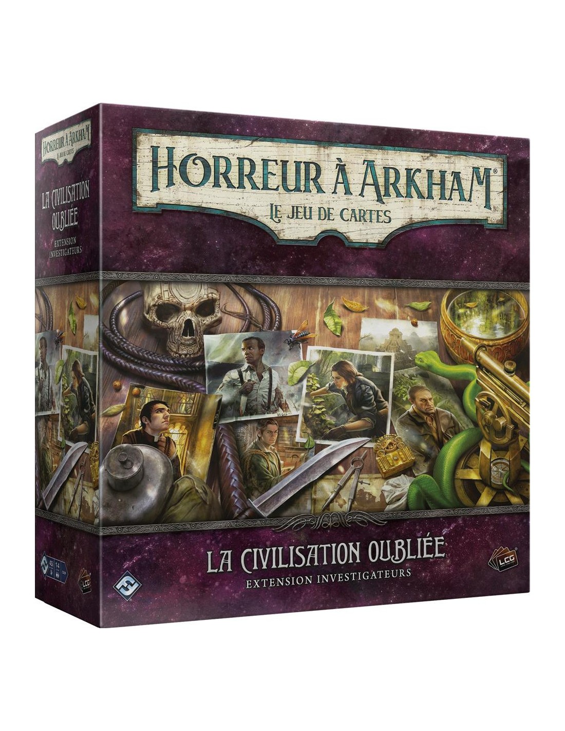 L'extension Investigateurs Civilisation Perdue comprend cinq investigateurs pour Arkham Horror: The Card Game et contient toutes les cartes de joueur du cycle de contenu original The Forgotten Age. Guidez votre groupe vers la sécurité en tant que chef d'expédition, Leo Anderson ; découvrez des étendues sauvages intactes en tant qu'exploratrice Ursula Downs ; faites une évasion rapide en tant que bootlegger, Finn Edwards; invoquez des miracles comme le prêtre, le père Mateo; et cherchez la force dans un sombre pacte en tant que hanté, Calvin Wright.