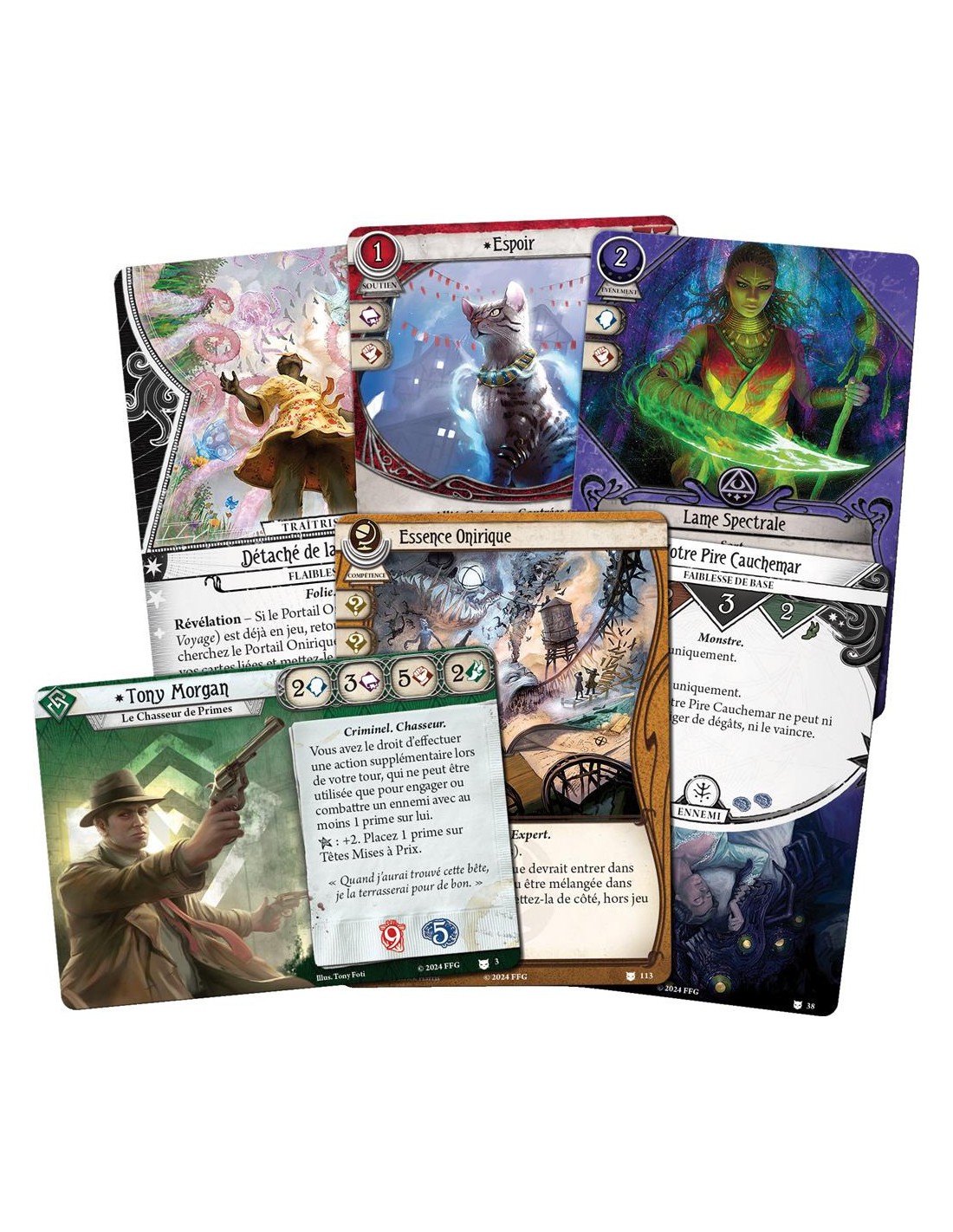 Horreur à Arkham : Le Jeu de Cartes - Les Dévoreurs De Rêves (Investigateurs) propose cinq investigateurs et contient toutes les cartes de joueur et les options de personnalisation présentées dans le cycle original des Mangeurs de Rêves. Protégez les innocents en tant que policier débutant, Tommy Muldoon ; recherchez des connaissances vitales en tant que chercheuse, Mandy Thompson ; traquez des cibles et récupérez leurs primes en tant que chasseur de primes, Tony Morgan ; modifiez le temps et l'espace en tant que rêveur, Luke Robinson ; et trouvez une force mystique dans le pouvoir de la musique en tant que violoniste, Patrice Hathaway. Horreur à Arkham : le Jeu de Cartes est un jeu de cartes coopératif dans lequel les joueurs incarnent des investigateurs qui tentent d’élucider de terrifiants mystères surnaturels.- Chaque enquêteur possède ses propres forces, faiblesses et capacités, ce qui vous permet de personnaliser votre expérience et votre stratégie de jeu.