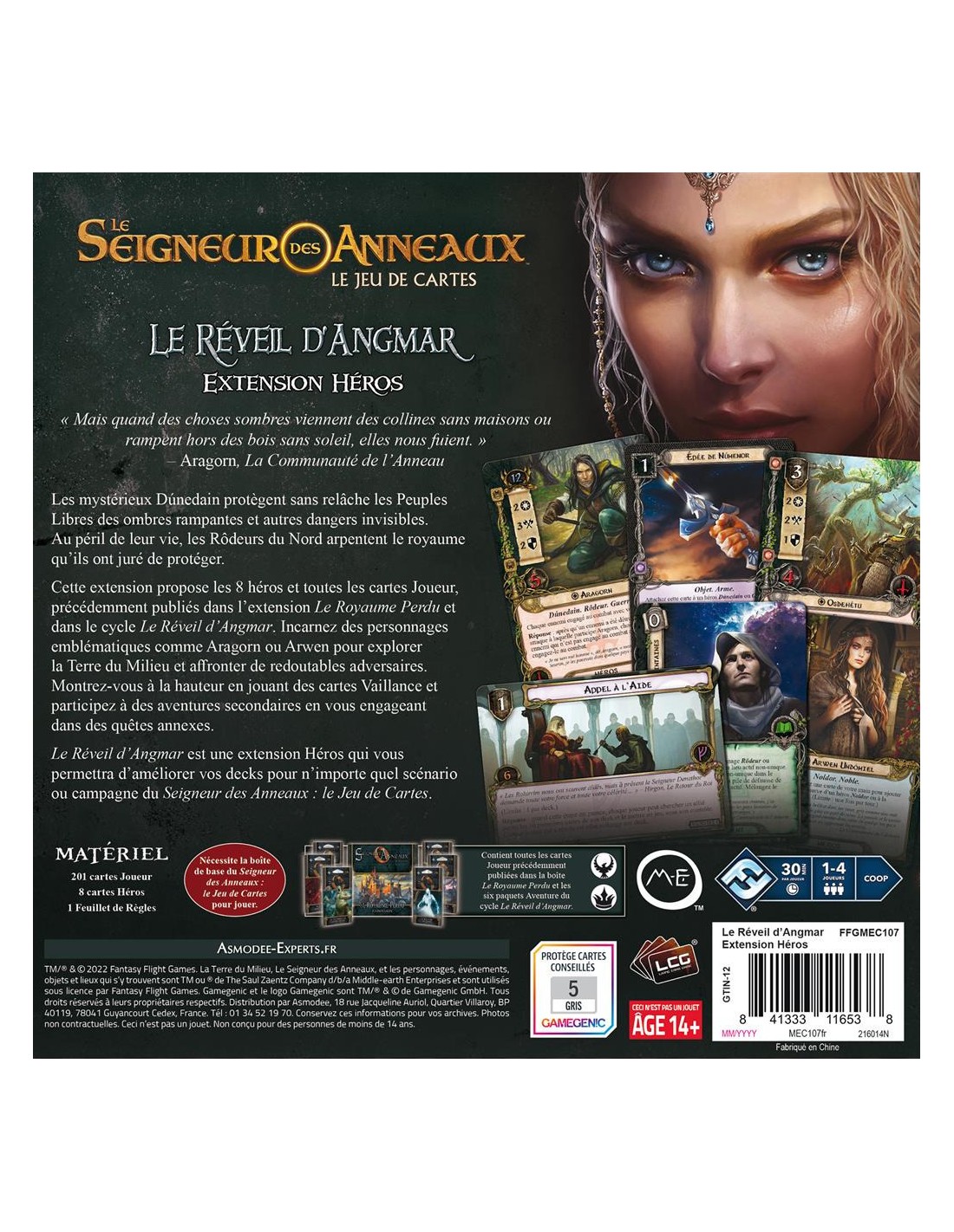 Aragorn, La Communauté de l'Anneau Le Réveil d'Angmar : de quoi améliorer vos héros ! Les mystérieux Dúnedain protègent sans relâche les Peuples Libres des ombres rampantes et autres dangers invisibles. Au péril de leur vie, les Rôdeurs du Nord arpentent le royaume qu'ils ont juré de protéger. Cette extension propose les 8 héros et toutes les cartes Joueur, précédemment publiés dans l'extension Le Royaume Perdu et dans le cycle Le Réveil d'Angmar, Incarnez des personnages emblématiques comme Aragorn ou Arwen pour explorer la Terre du Milieu et affronter de redoutables adversaires. Montrez-vous à la hauteur en jouant des cartes Vaillance et participez à des aventures secondaires en vous engageant dans des quêtes annexes. Le Réveil d'Angmar est une extension Héros qui vous permettra d'améliorer vos decks pour n'importe quel scénario ou campagne du Seigneur des Anneaux : le Jeu de Cartes.