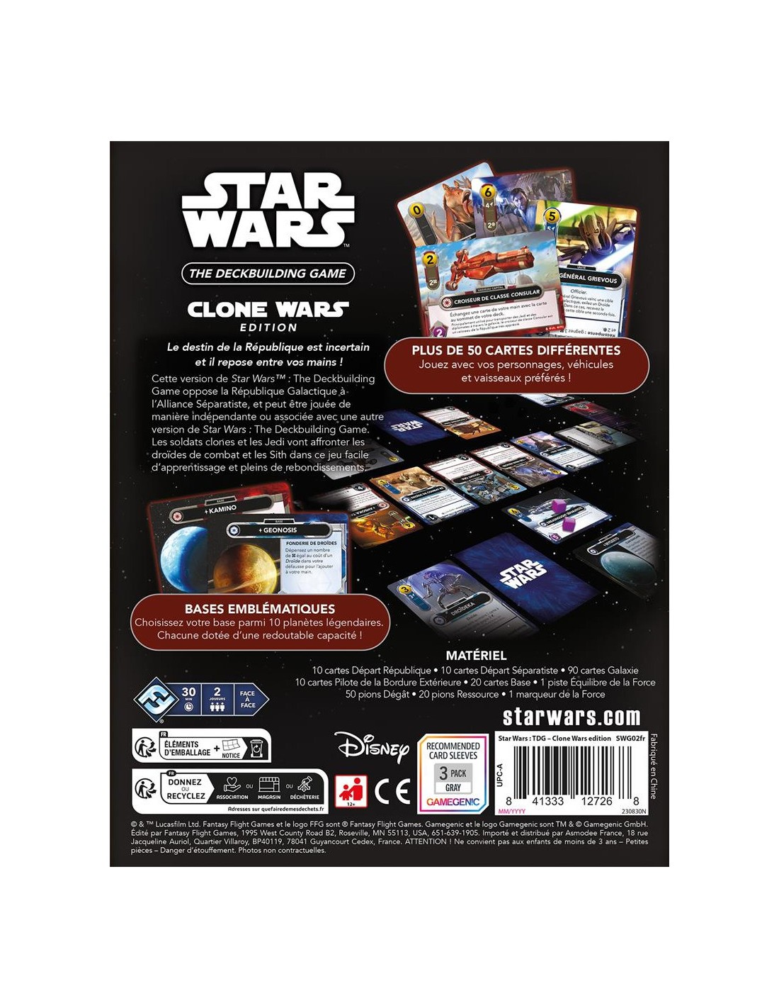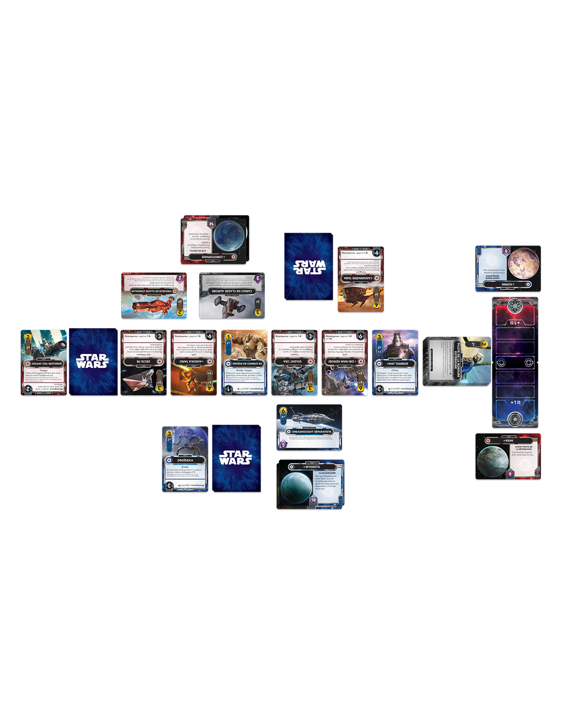 Dans le jeu Star Wars : The Deckbuilding Game - Clone Wars, la guerre entre la République Galactique et la Confédération Séparatiste prend vie sous vos yeux. Dans ce jeu de cartes facile à apprendre, vous et votre adversaire choisissez chacun un camp, en incarnant soit la République, soit les Séparatistes, et au fur et à mesure que le jeu progresse, vous renforcez tous deux la puissance de vos decks de départ et travaillez à détruire les bases de l'autre.