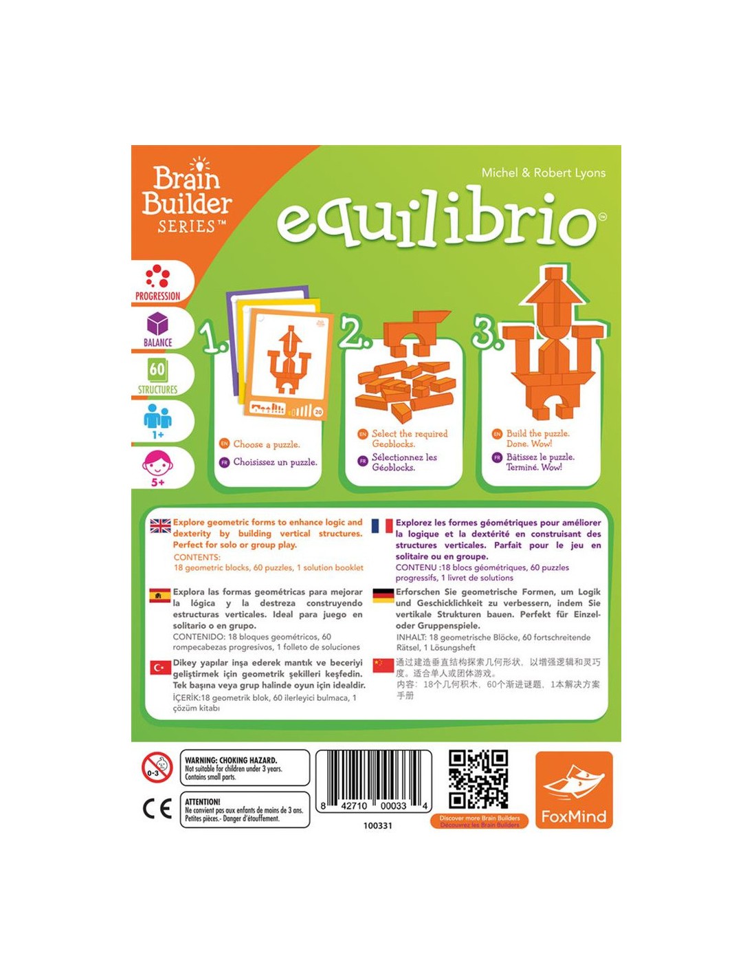 Equilibrio fait partie de la ligne Architecto qui comprend 4 jeux de visualisation spatiale où les joueurs progressent à leur rythme à travers une série de puzzles qui deviennent de plus en plus difficiles. Les jeux comprennent le même ensemble de Geoblocks et un livret de puzzle séparé en 6 niveaux de difficulté.