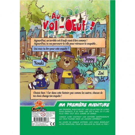 Tu as toujours rêvé d’être un héros ? La gamme Ma première aventure t’offre cette opportunité. Ouvre le livre choisi un personnage et construit ton histoire en faisant des choix matérialisés par des pages coupées en 3. Dans Ma première aventure : au vol-œuf, mène l’enquête pour retrouver les œufs qui ont été volés.