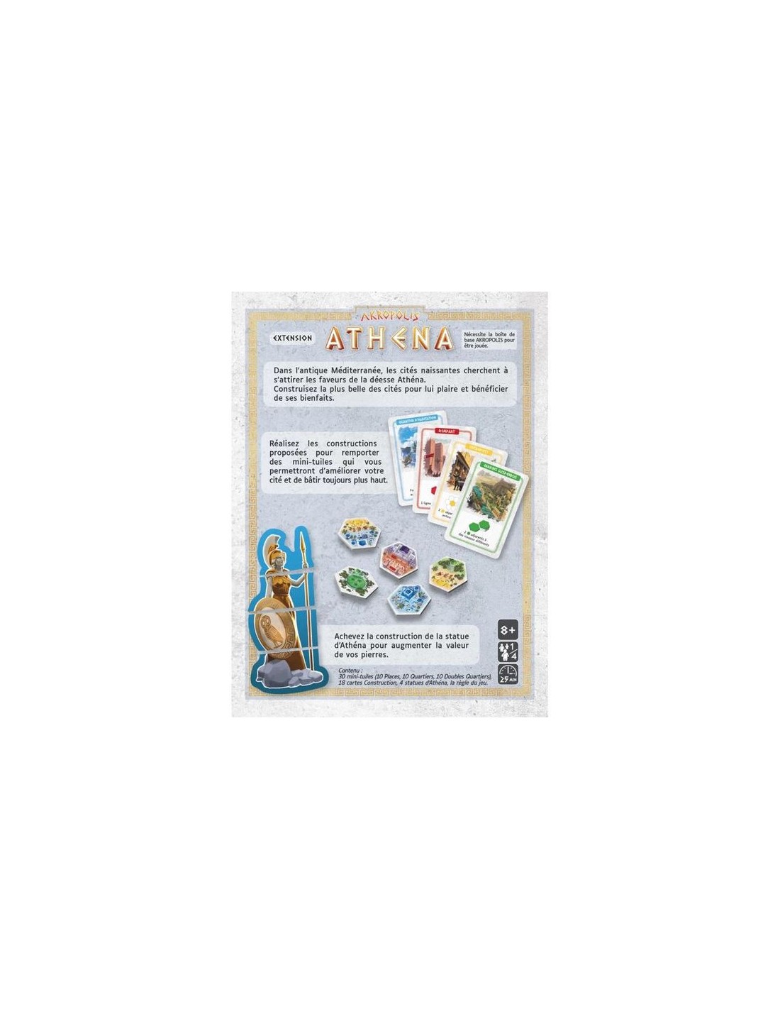 À chaque fois que vous réussissez, vous pouvez obtenir des parties de la Statue d'Athéna et des mini-tuiles pour améliorer vos constructions. Le jeu intègre les règles de base d'Akropolis avec des défis supplémentaires pour remplir les cartes de Construction. Chaque joueur doit gérer ses ressources et ses placements avec soin pour maximiser ses points.