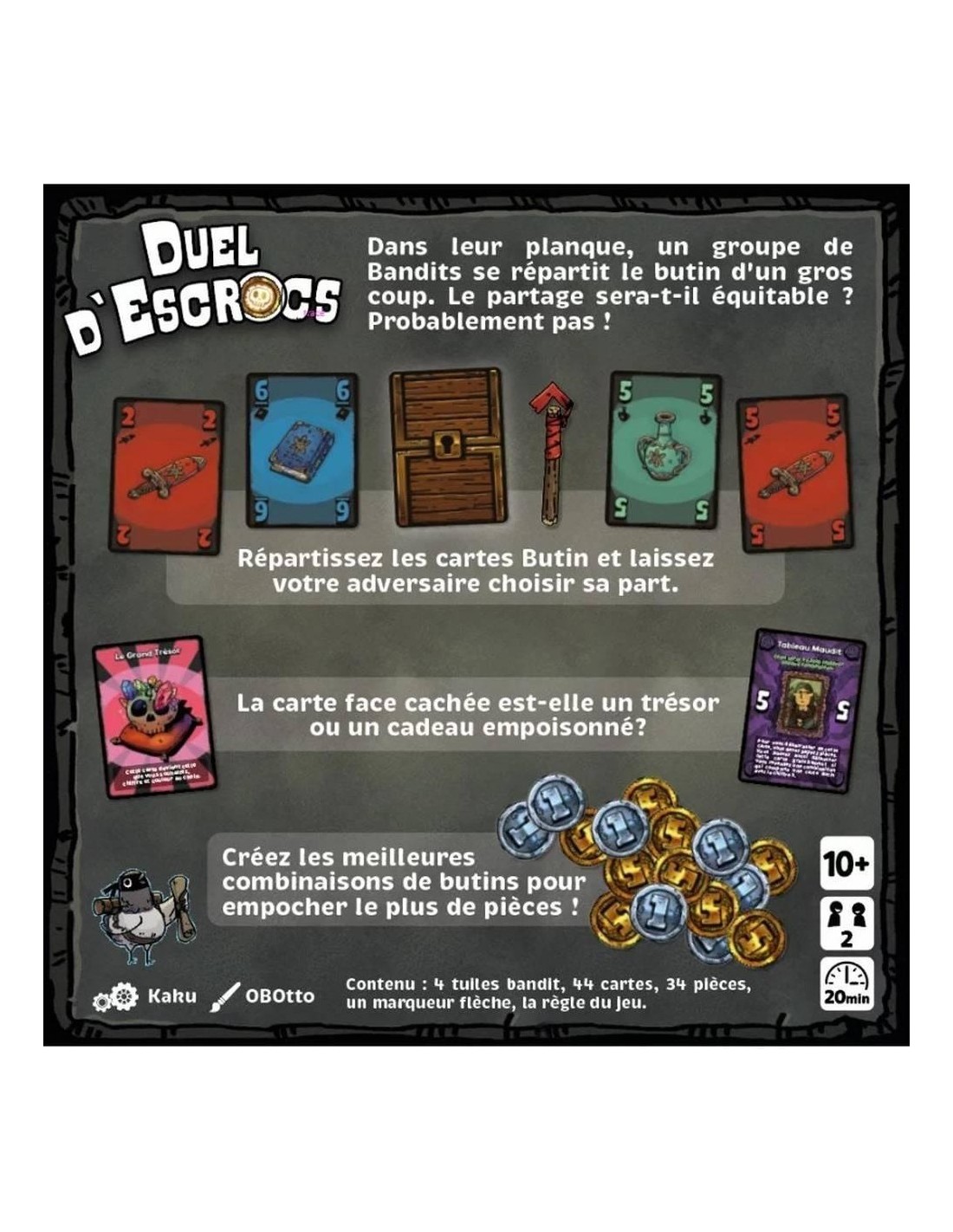 Votre bande de brigands vient de réaliser un gros coup et vous vous répartissez le butin. Le partage va-il être équitable ? Probablement pas… Tentez de récupérer plus de trésors que votre adversaire dans ce jeu à deux où le bluff et la ruse seront de mise !