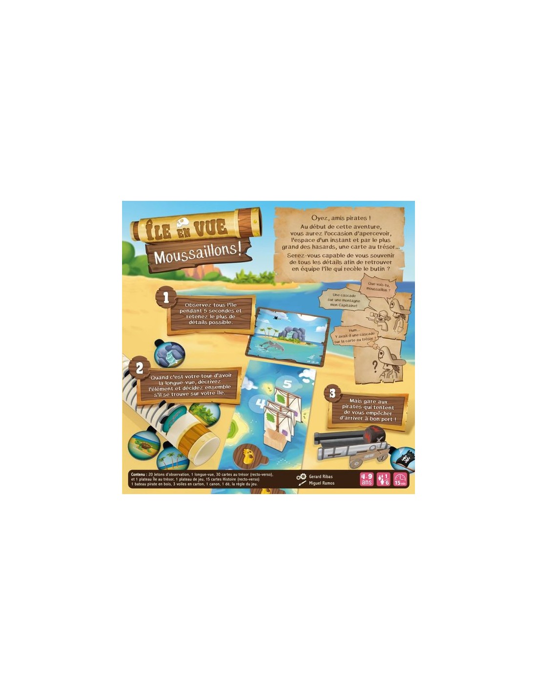 Dans le jeu Île en Vue : Moussaillon, observez tous une île pendant 5 secondes et retenez le plus de détails possible. Quand c'est votre tour, regardez dans la longue-vue et décrivez ce que vous voyez pour décidez ensemble si les éléments se trouvent sur votre île.