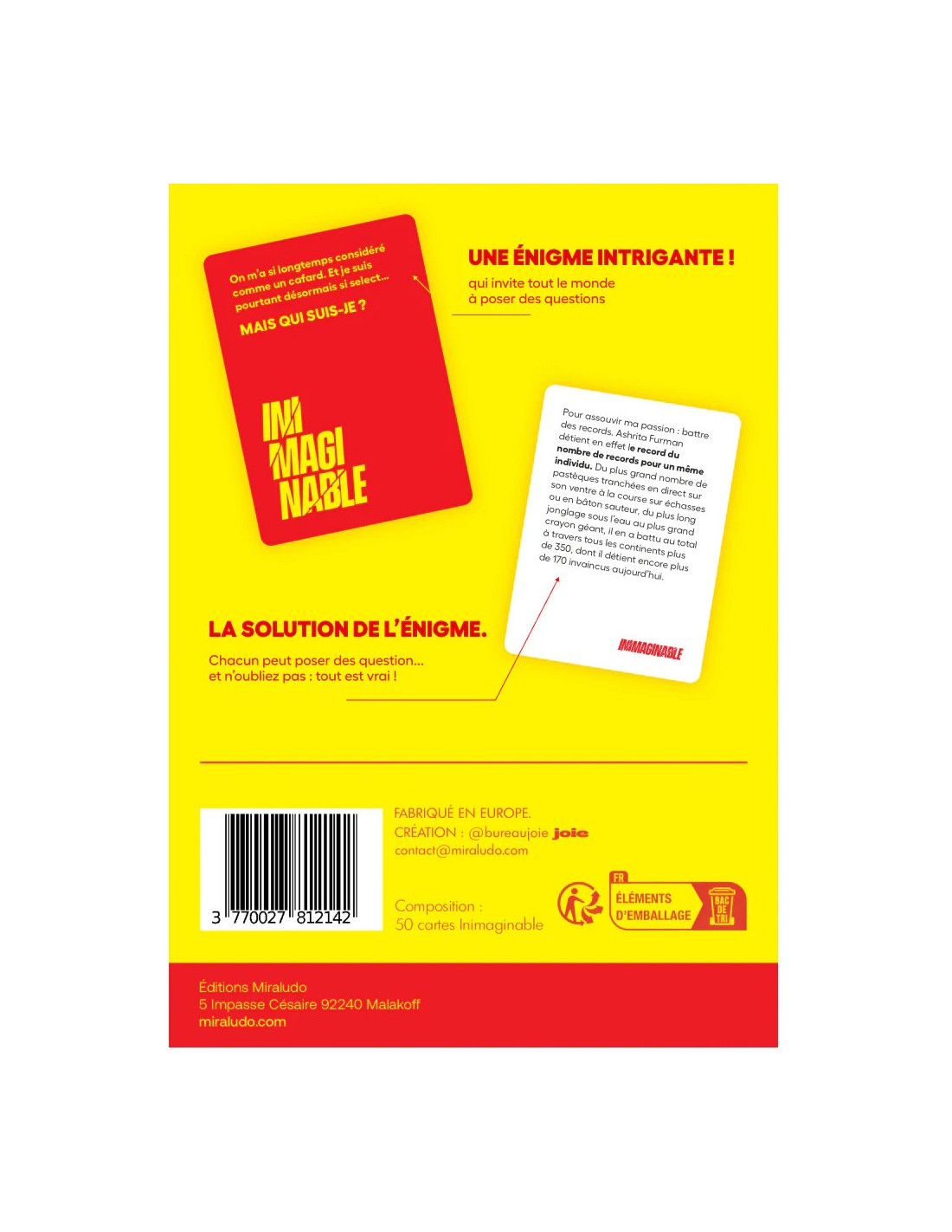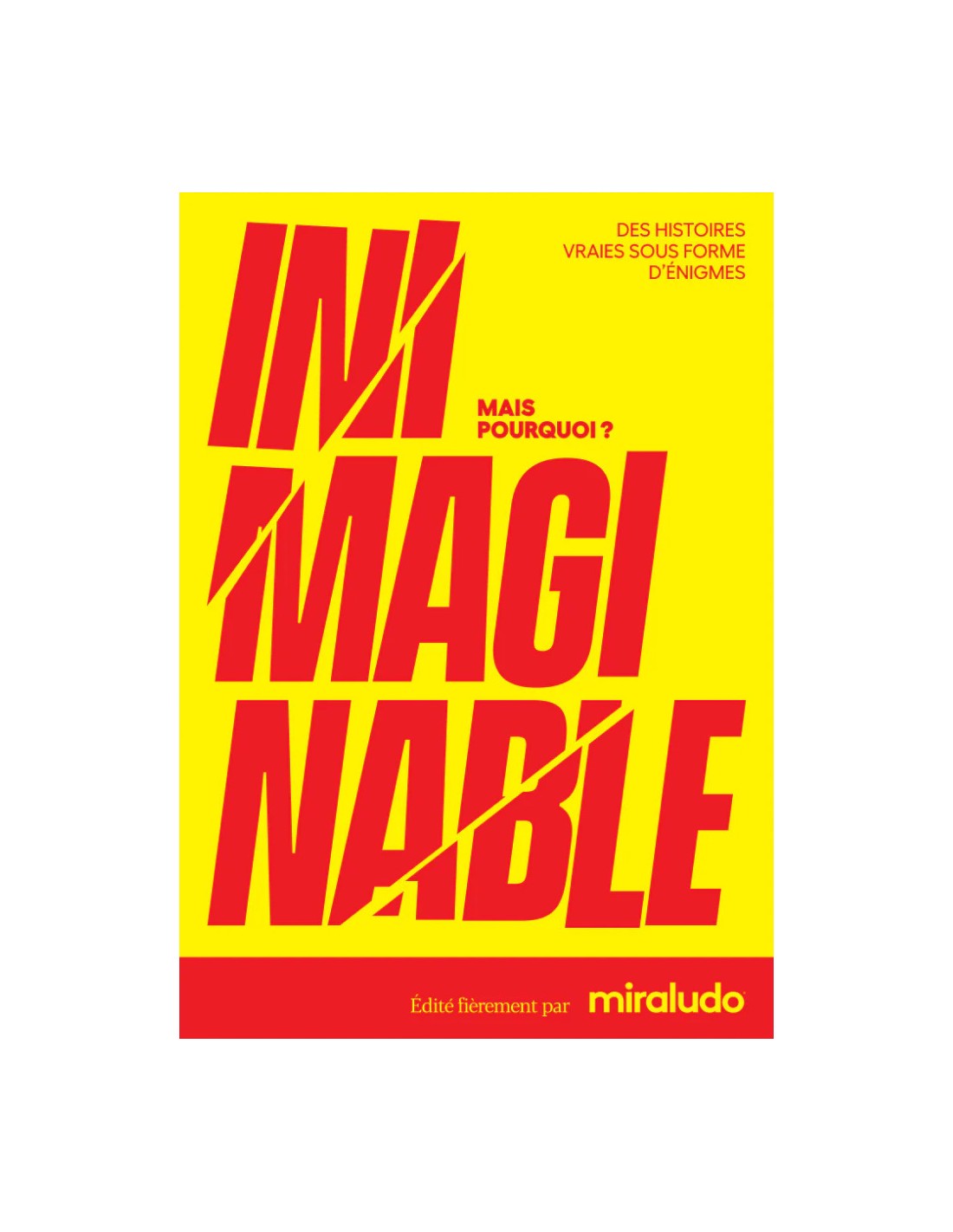 Inimaginable – Le Jeu des Enigmes biens réelles Dans Inimaginable, explorez des faits incroyables mais pourtant réels ! Chaque carte présente une énigme surprenante, et les joueurs doivent poser des questions fermées (oui/non) pour en découvrir l’explication. Exemples : On découvrira par exemple qu'à Strasbourg, au Moyen Âge, des centaines de personnes ont été prises dans une épidémie de danse !