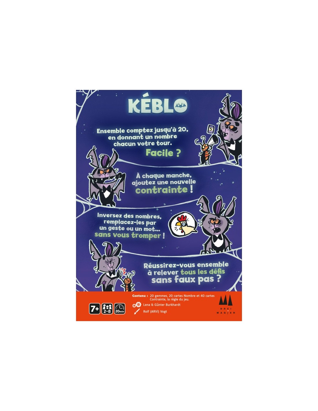 Toutes les cartes de Contrainte sont retournées. Les joueurs ont remporté la partie ! Ils peuvent poursuivre en plaçant 4 nouvelles cartes Contrainte sur la table et entamer un nouveau tour de comptage.Il n'y a plus de gemmes sur la table. Le jeu se termine au moment même où la dernière gemme est remise dans la boîte. Il faut réessayer !- Age : A partir de 7 ans