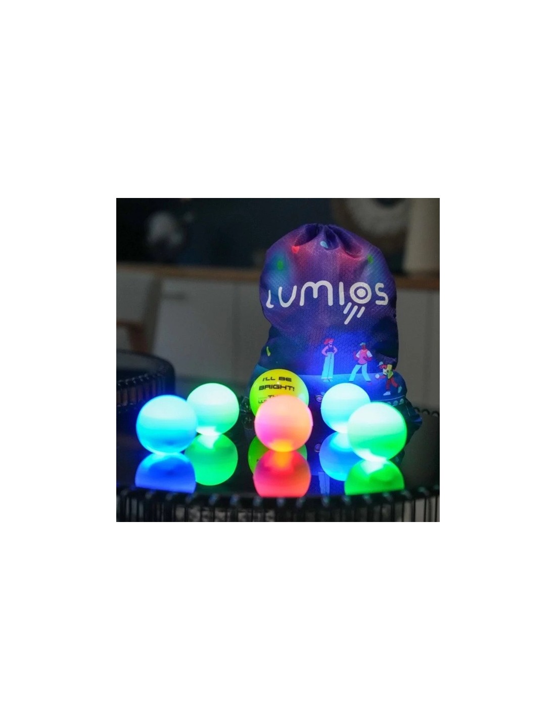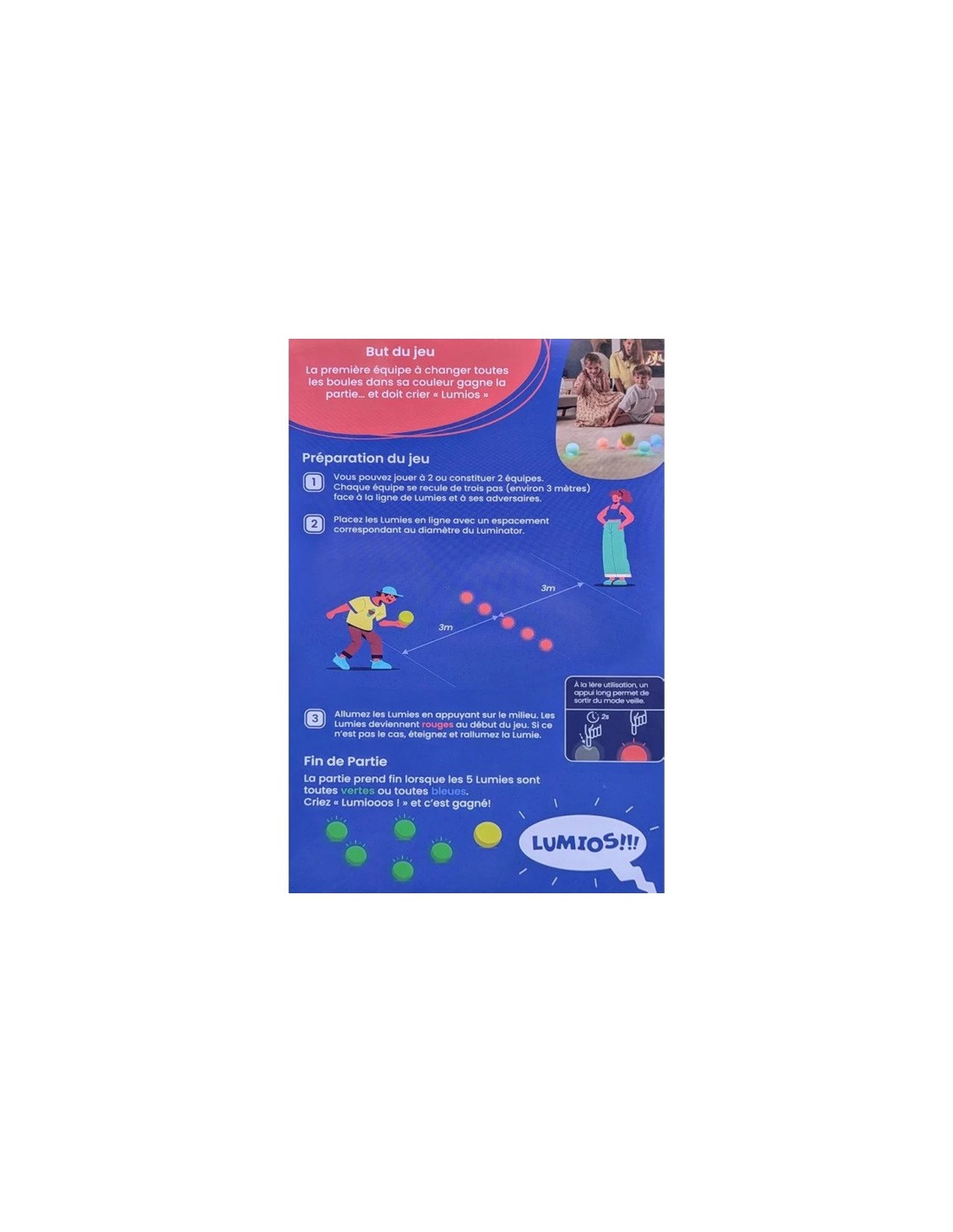 Lumios, le jeu de boules lumineuses pour les enfants… et les parents. 5 boules de votre couleur, et c'est gagné Au départ, il y a 5 boules rouges alignées au milieu. Deux équipes jouent l’une face à l’autre. Celui qui commence doit toucher une boule rouge. Elle devient aléatoirement soit verte soit bleue et ça définit la couleur de son équipe.